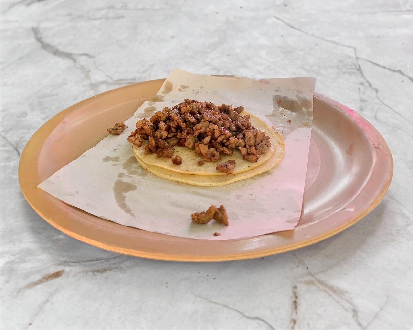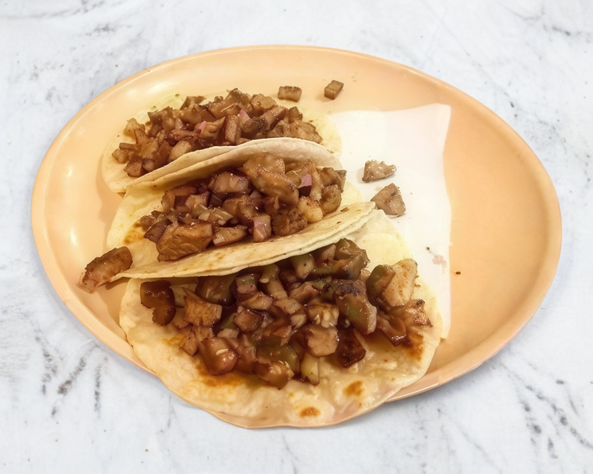 Tortilla de harina acompañada de carne de pastor, queso manchego, cebolla y cilantro