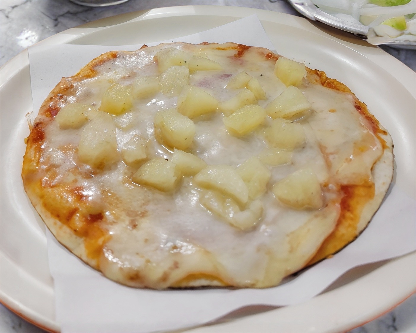 1 Pizza hawaiana - Ingredientes: pan árabe bañado en salsa de tomate, jamón, piña en trocitos y queso manchego derretido. Se envía con limones, salsa chipotle y cebollas en rajas con habanero.