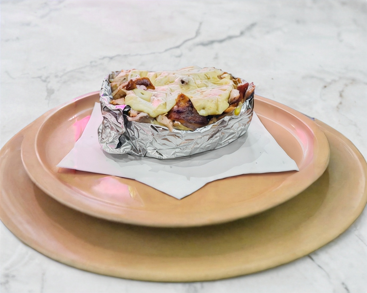 Papa cocida al carbón acompañada de carne árabe - queso manchego