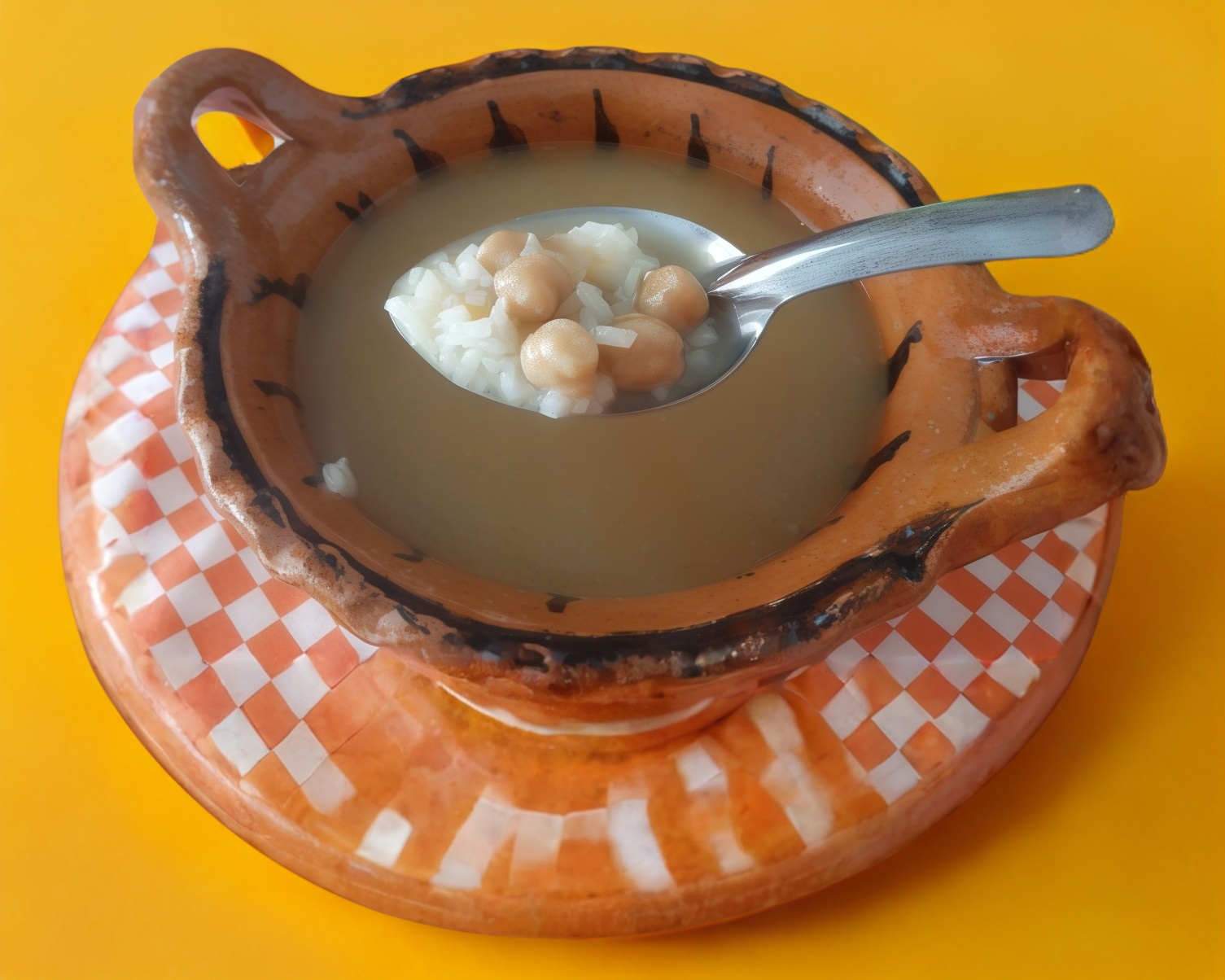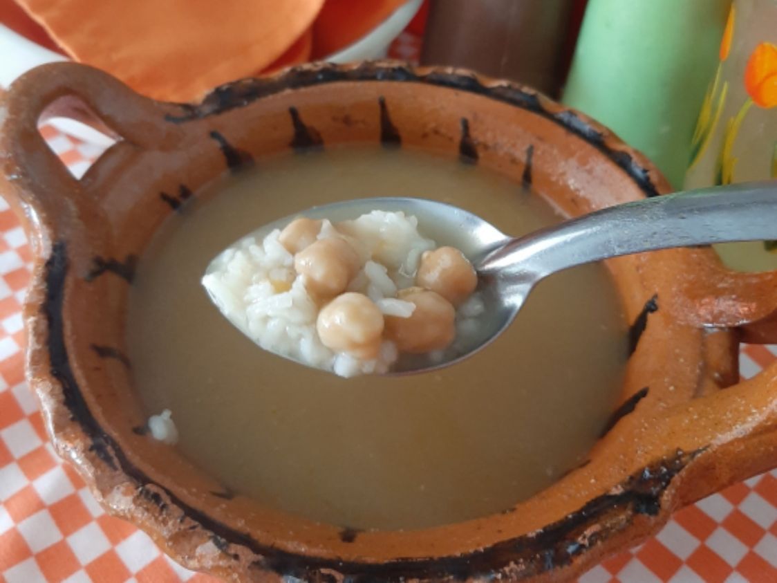 Consomé acompañado de arroz y garbanzo.