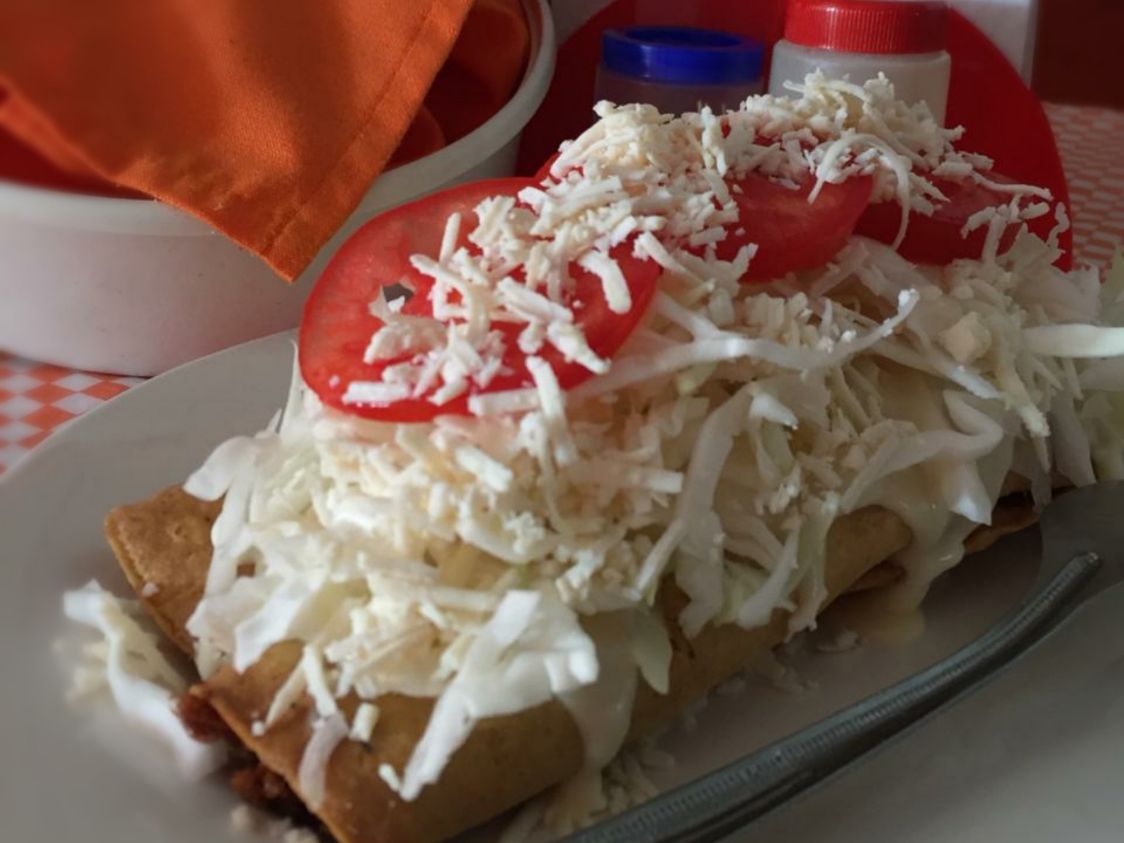 1 Taco dorado de pollo con col, jitomate, queso en polvo y crema. (En la imagen ilustrativa se muestran 2 tacos dorados)
