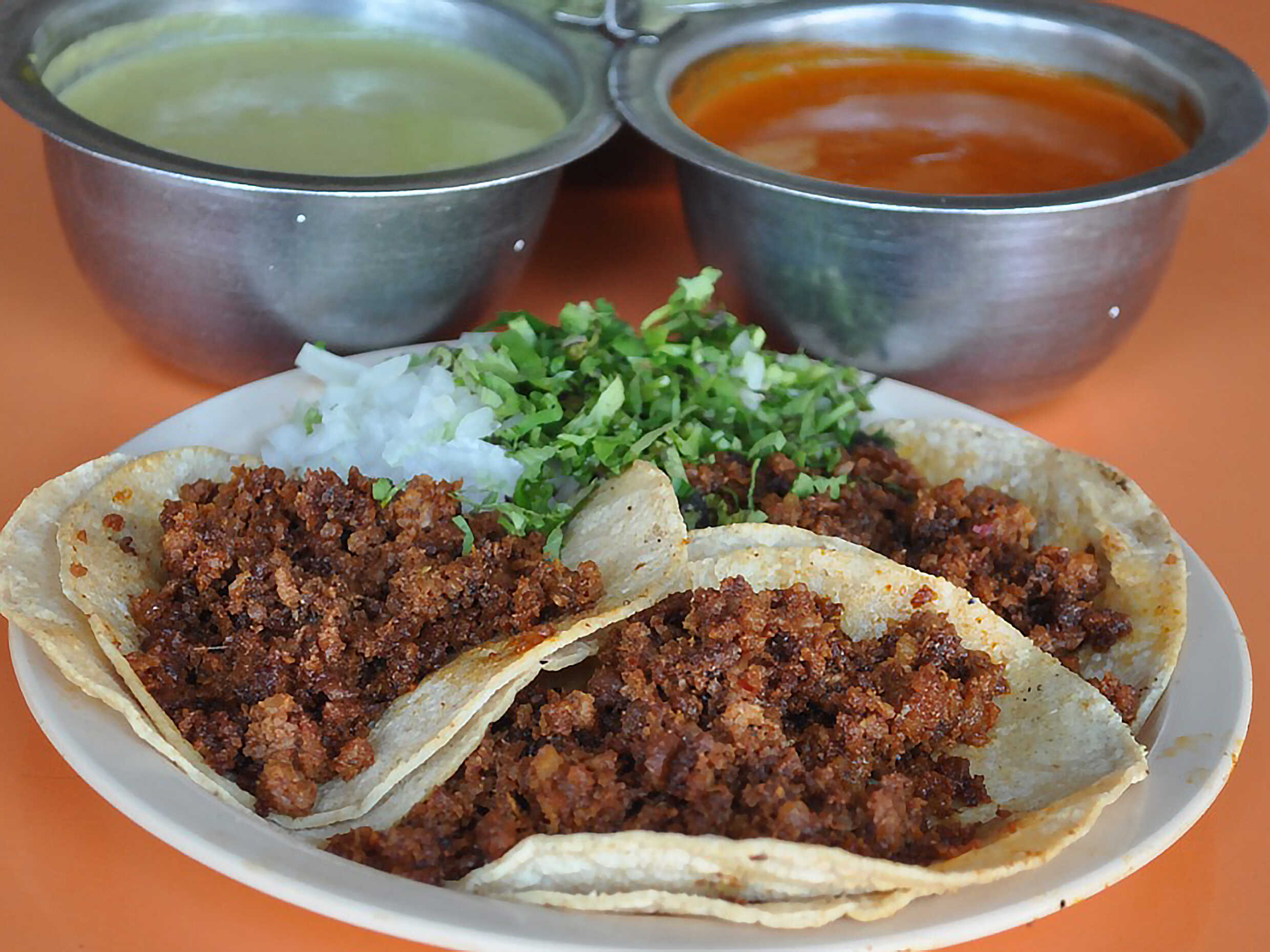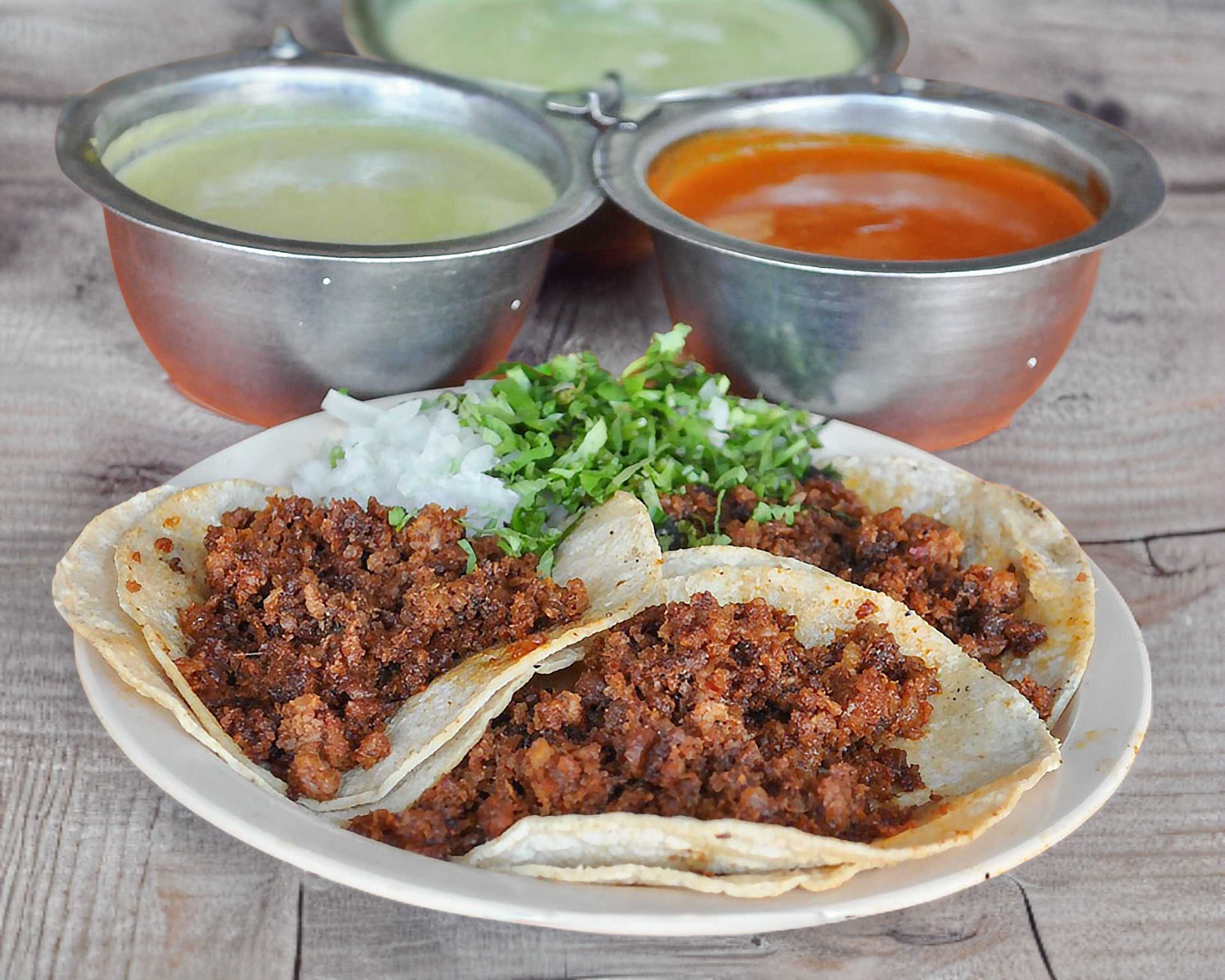 Tortilla de maíz carné de bistec carné de longaniza, cebolla y cilantro acompañado de cebollitas y nopales