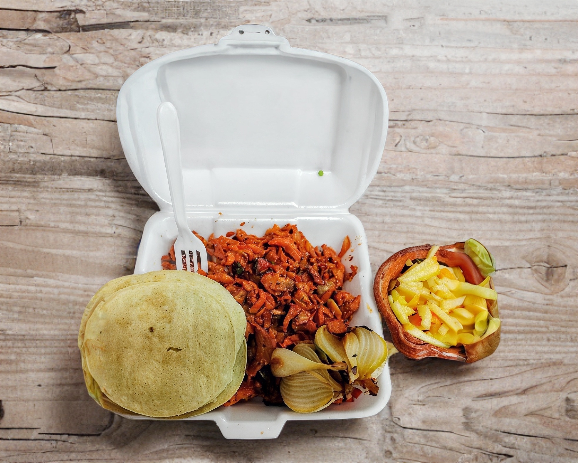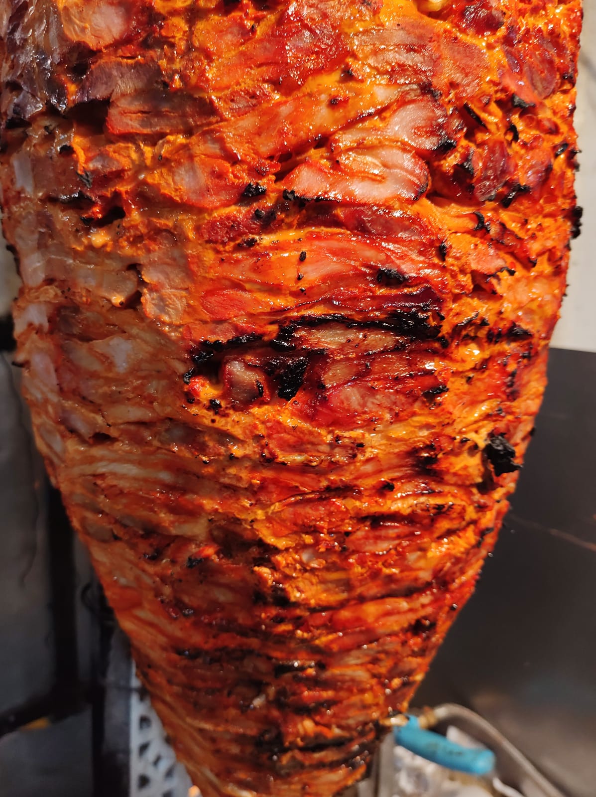 1 kilo de carné al pastor, 1/2 kilo de tortillas ,piña, salsas, cebolla y cilantro.