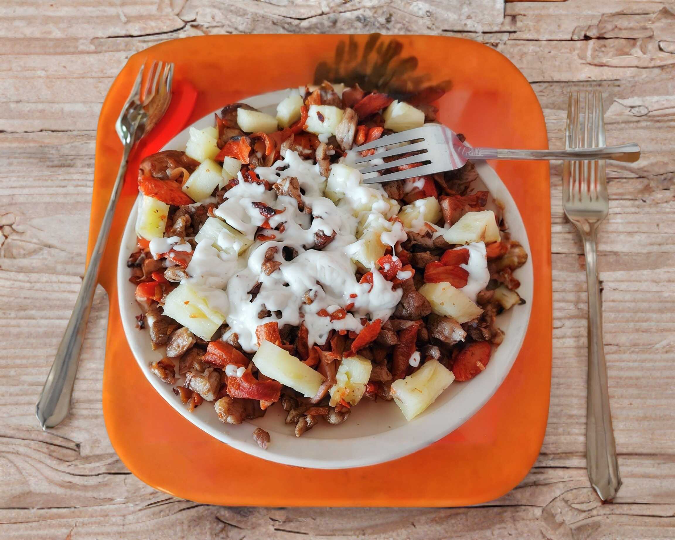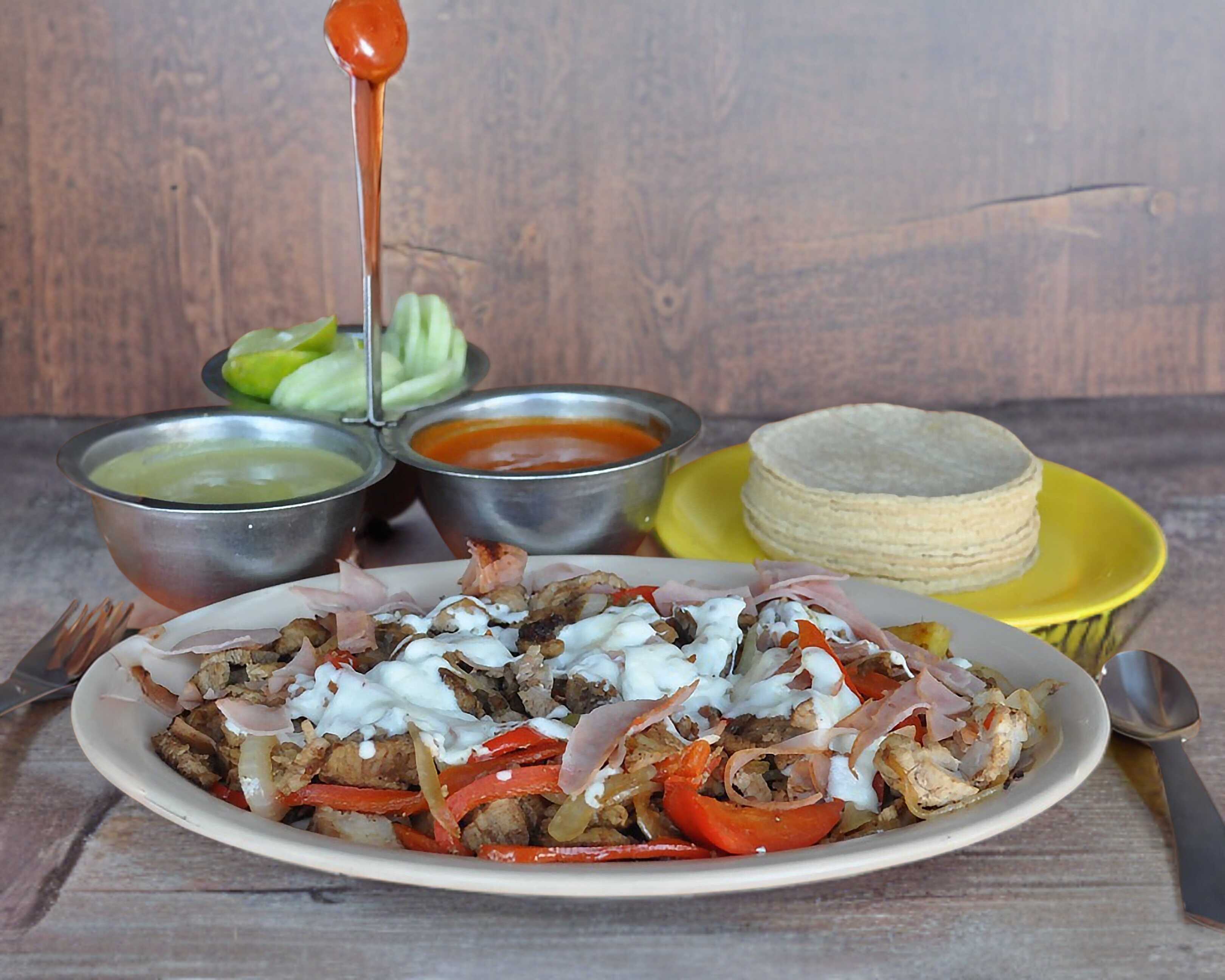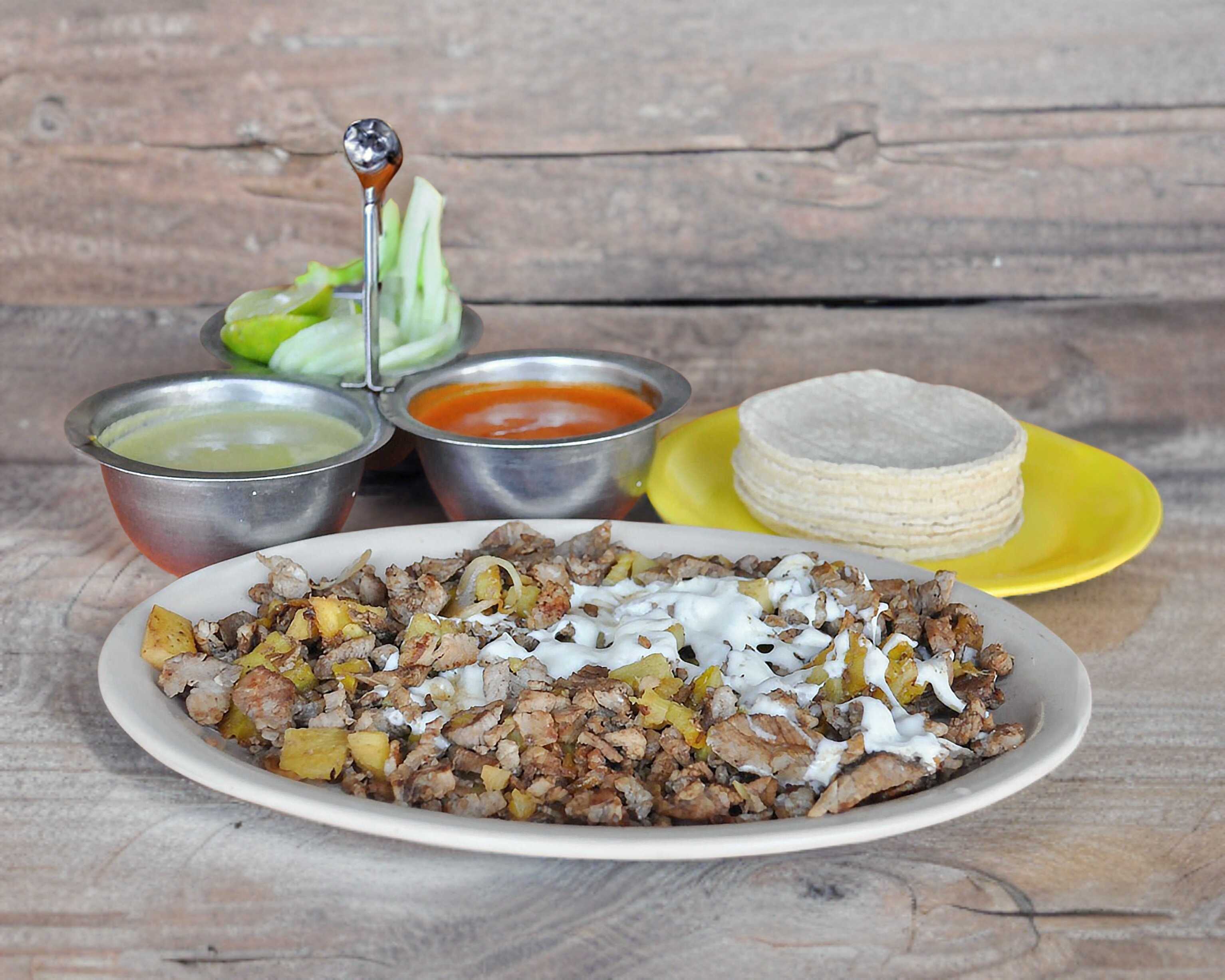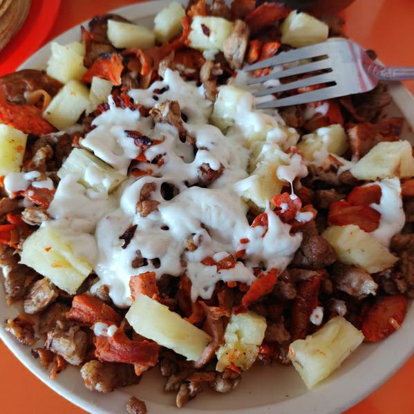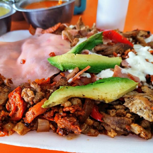 Carne al carbón estiló iguala, pastor, bistec, chorizo, jamón, aguacate, queso, frijoles, lechuga, cebolla, jitomate.
