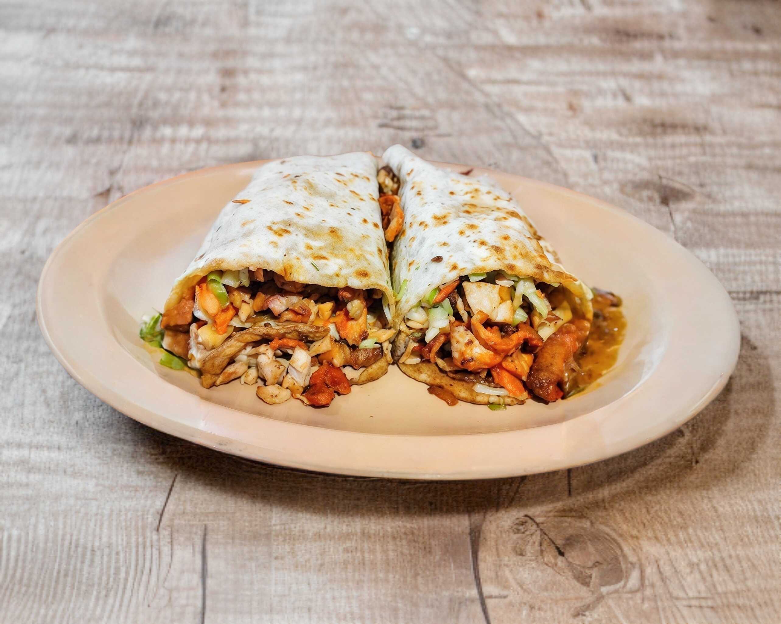 Carné de bisteck, pastor, queso, frijoles, aguacate, lechuga, cebolla, jitomate