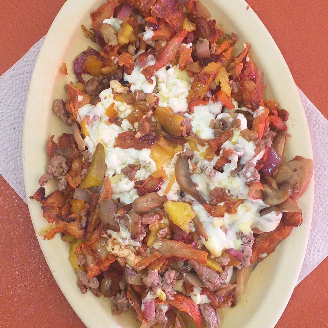 Chuleta, tocino, cebolla, morrón, jamón, queso