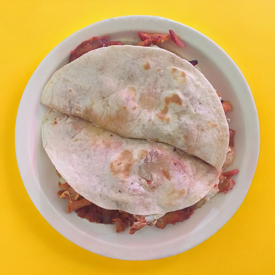 Bistec, pastor, morrón, cebolla, jitomate y queso.