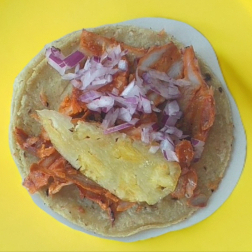 Chuleta,pastor, cebolla, jitomate, piña y queso.
