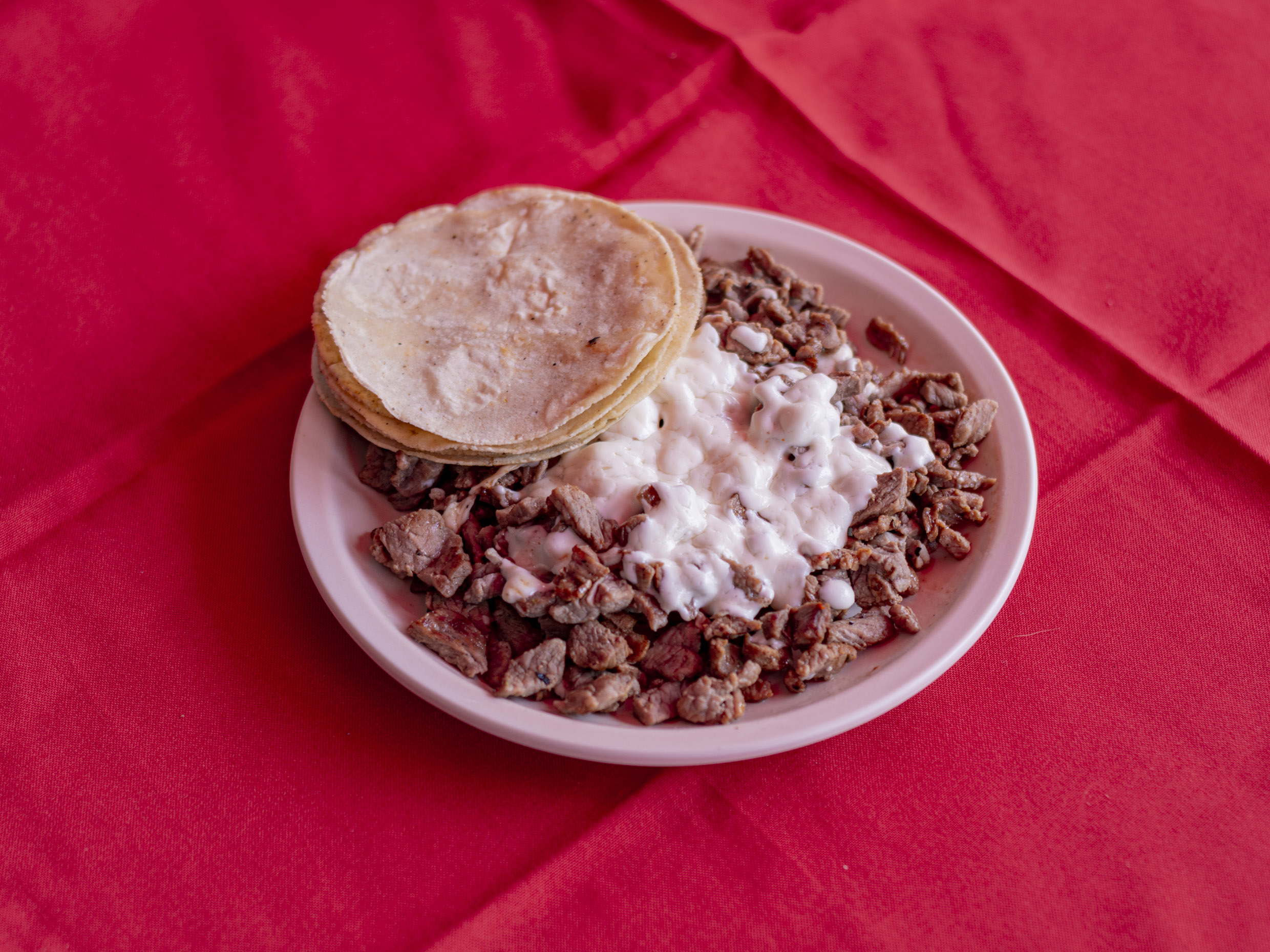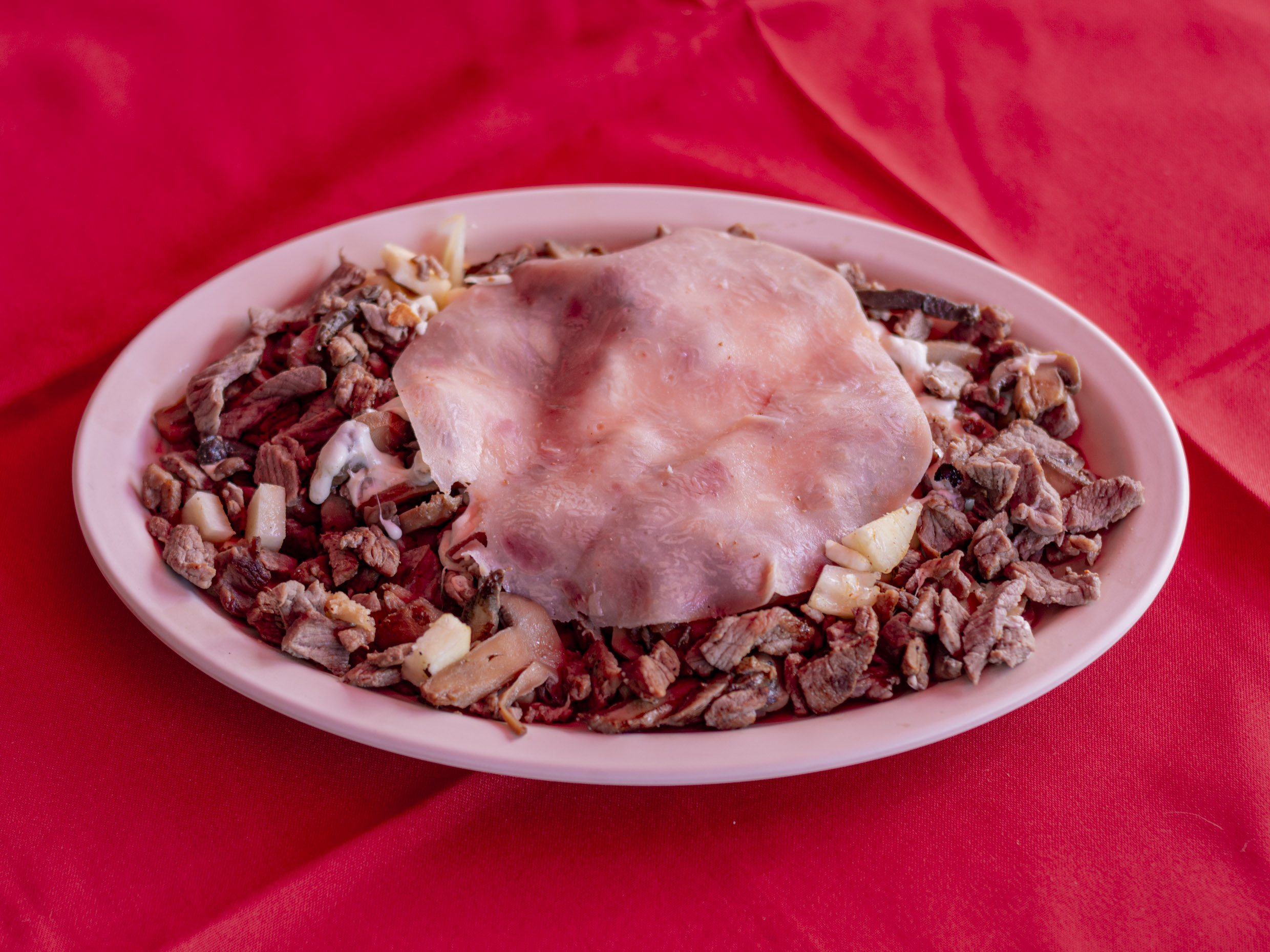 Tortilla de harina, bistec, jamón y queso.