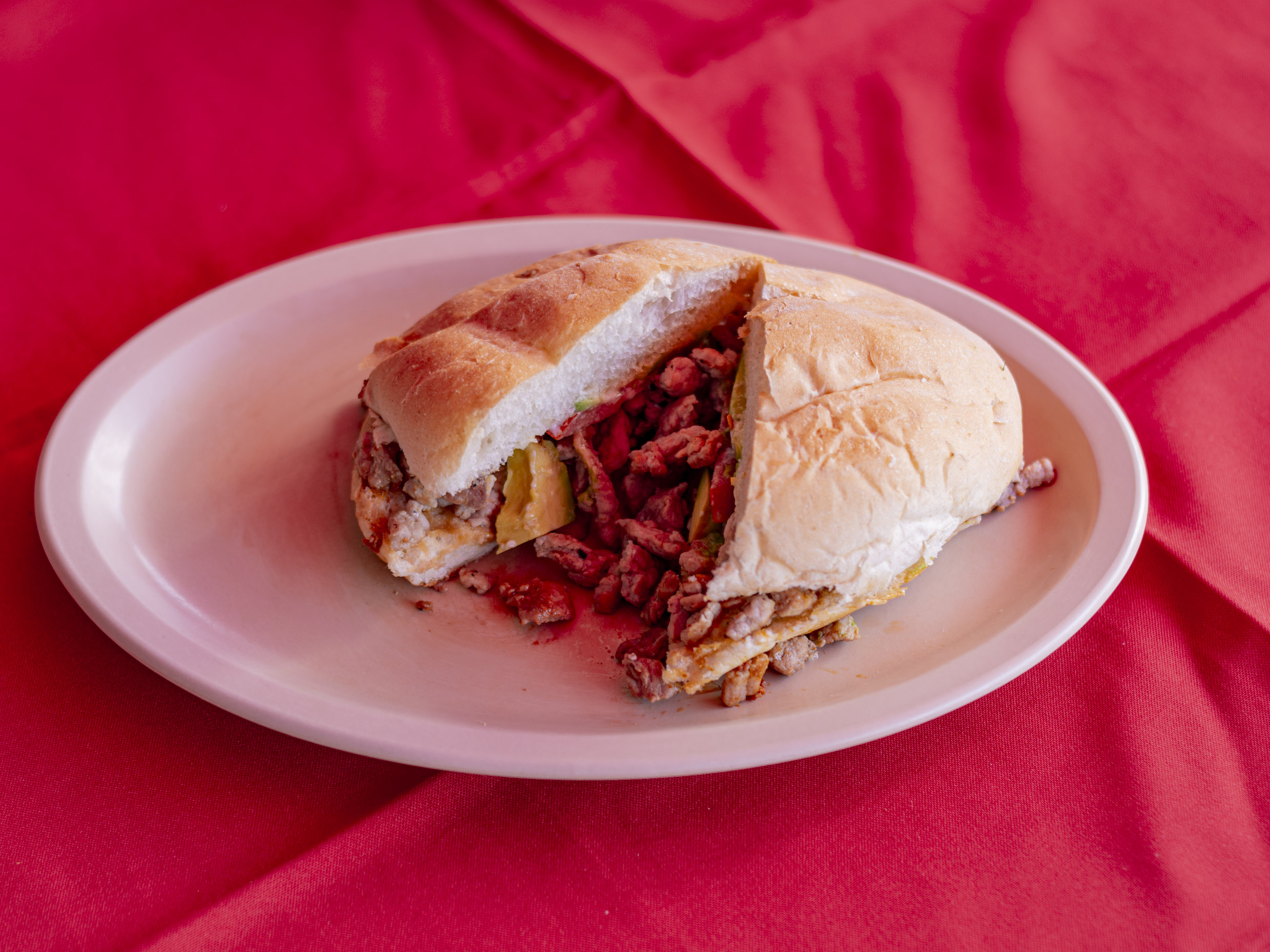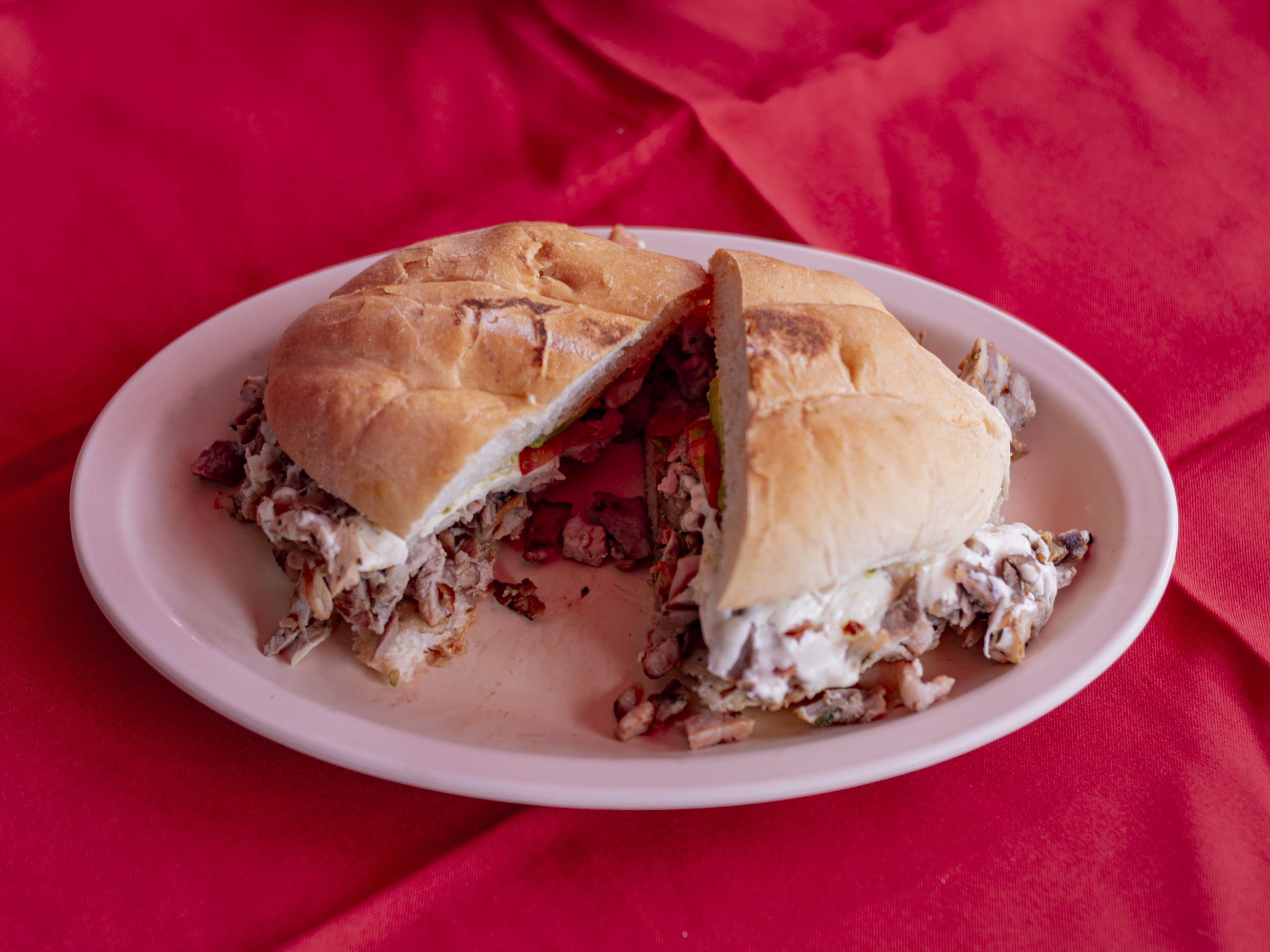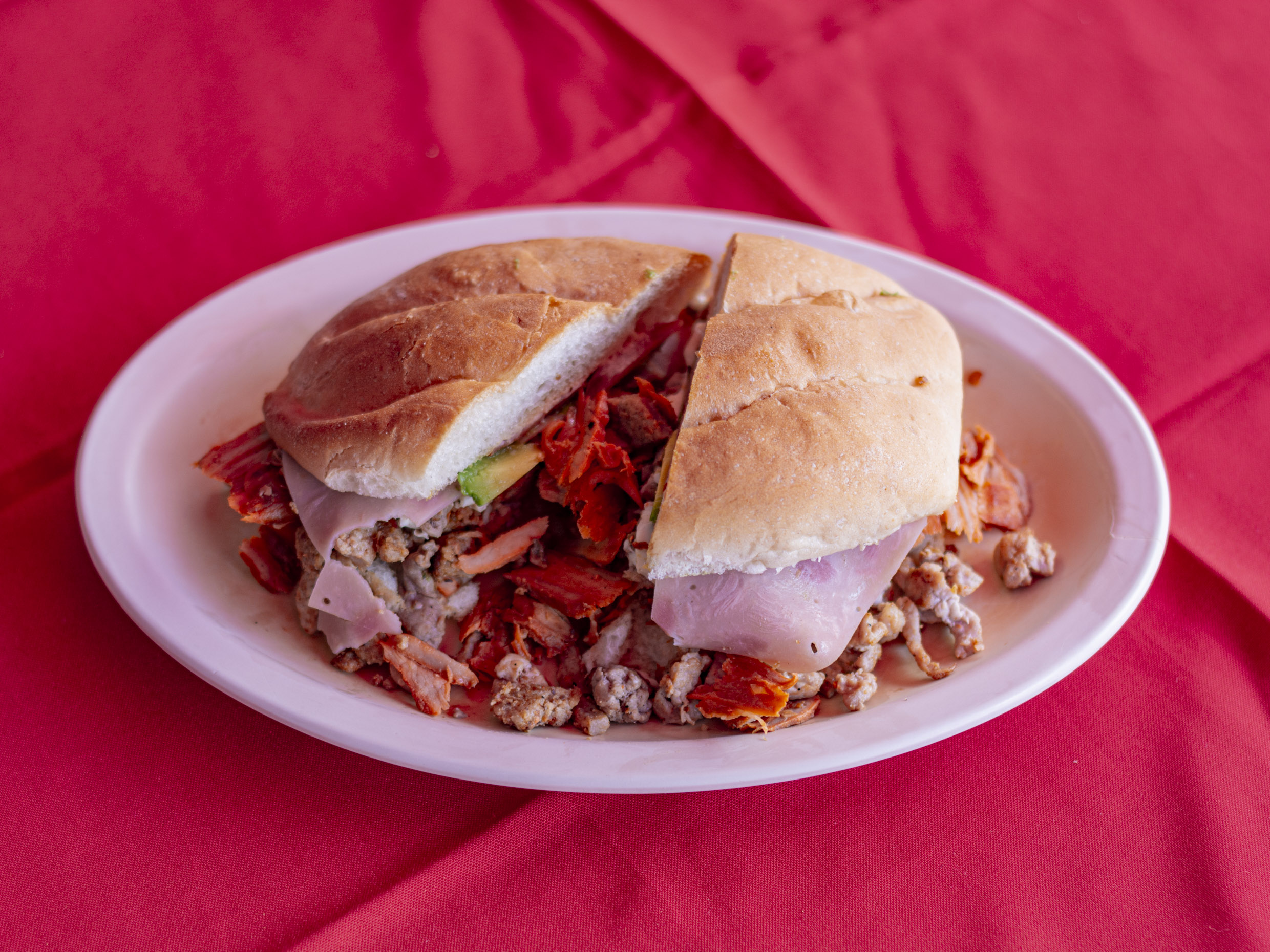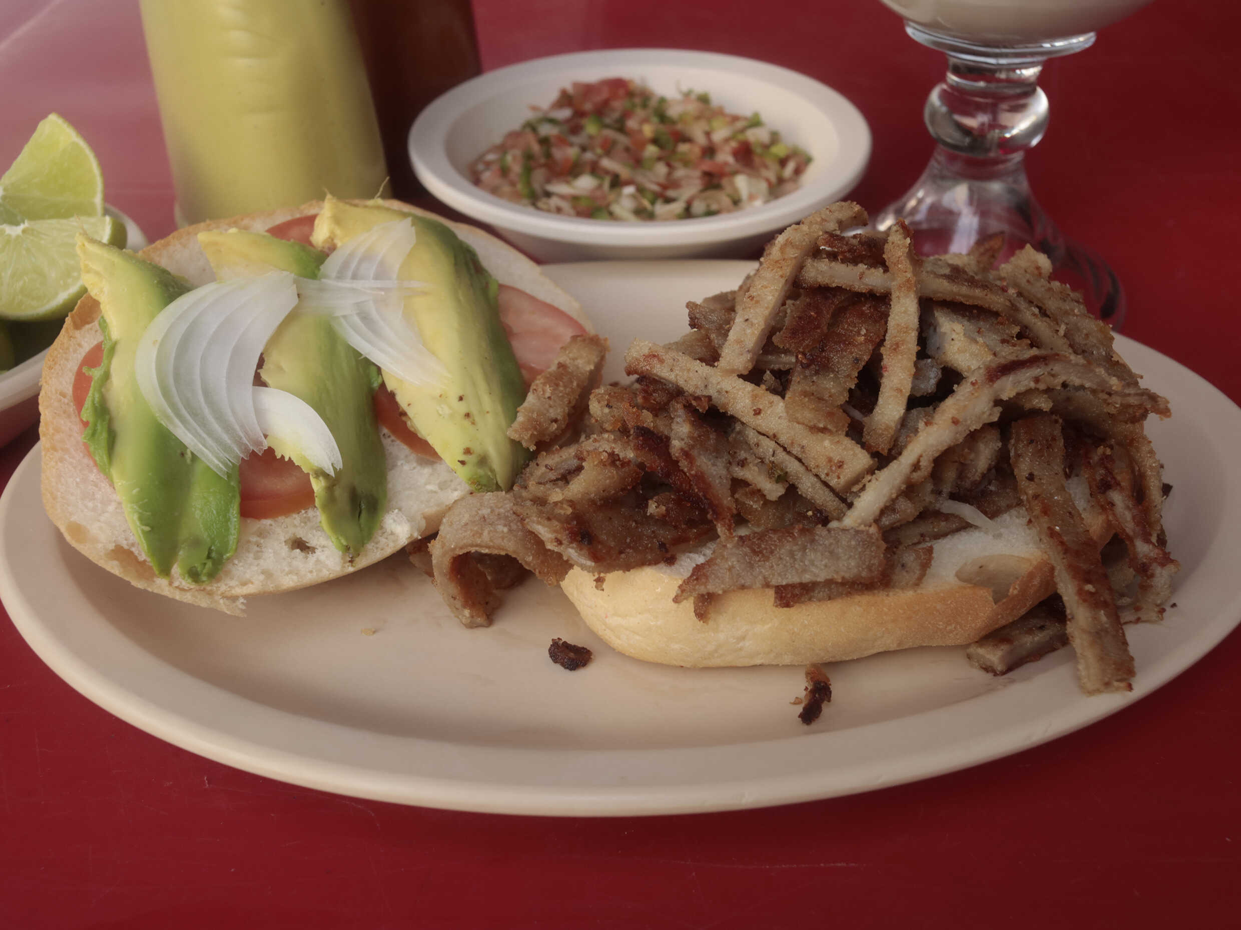 Mayonesa, jitomate, cebolla, aguacate y salsa chipotle.
