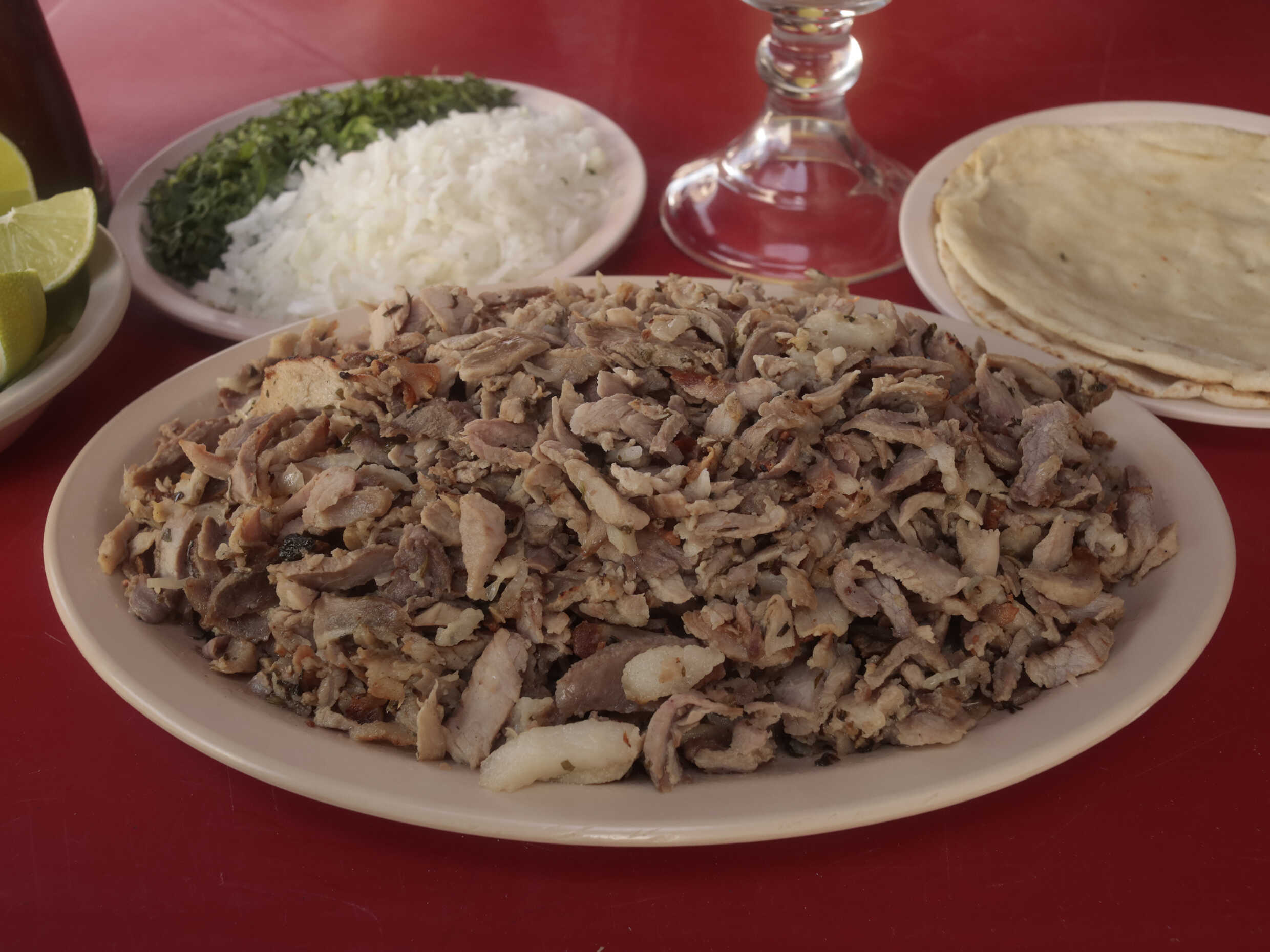 Cebolla, cilantro, pan árabe, salsas, totillas y limones.