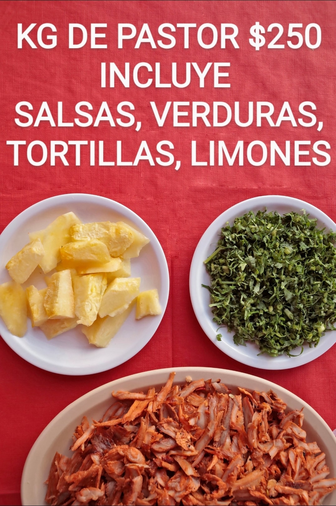 Cebolla, cilantro, piña, salsas, totillas y limones.