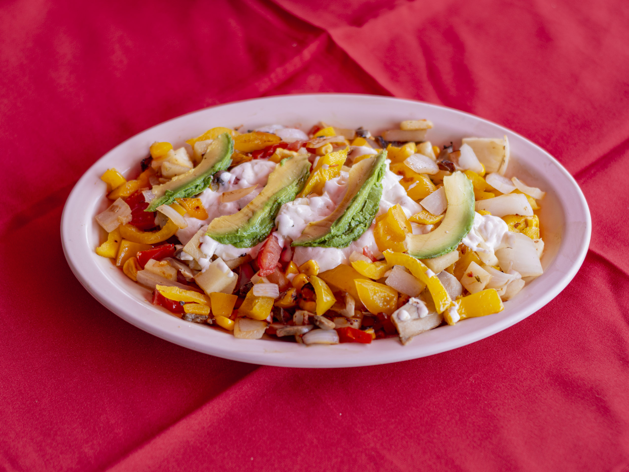 Cebolla, morrón, champiñones, elote, piña, jitomate, aguacate y queso.