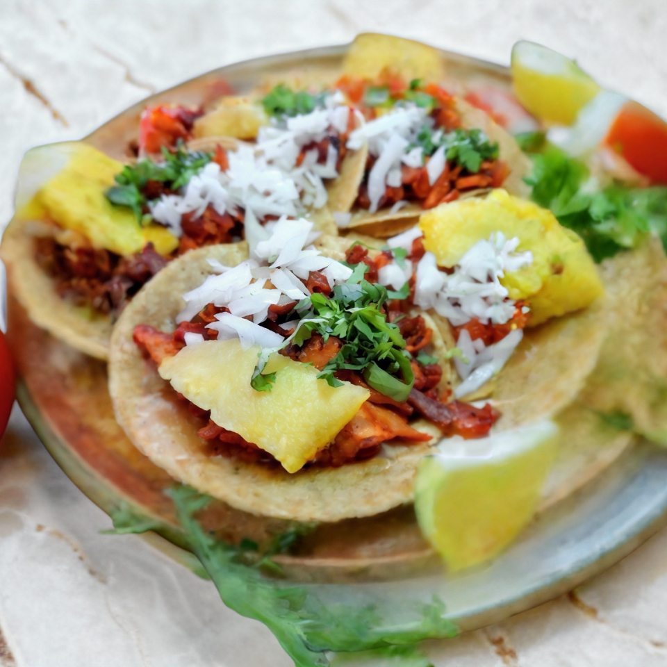 Tacos de pastor en tortilla de maíz dorada a la plancha para un toque crujiente.