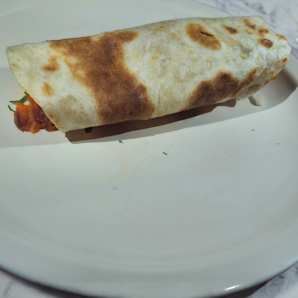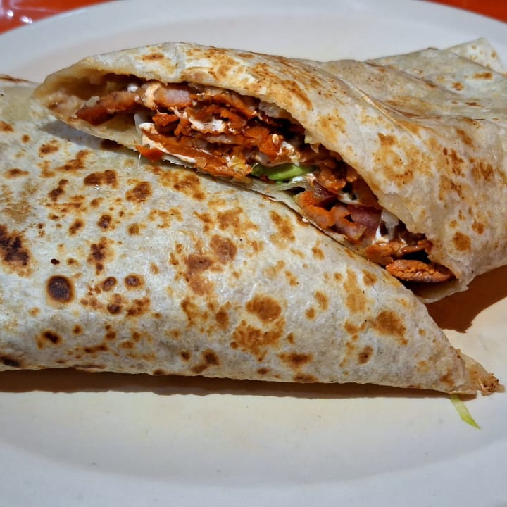 Pastor servido en tortilla de harina dorada a la plancha, con un toque más tostado.
