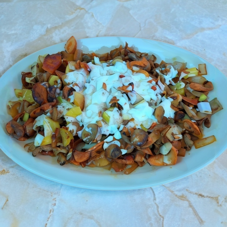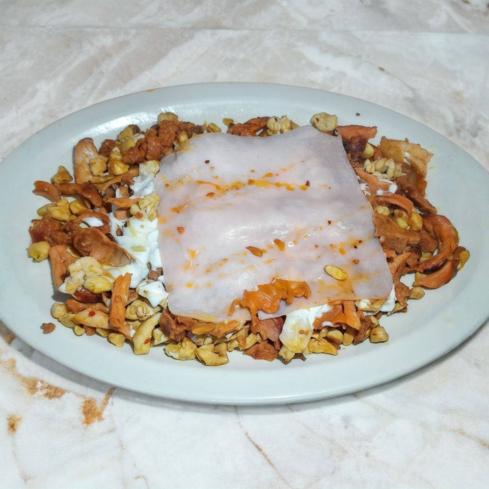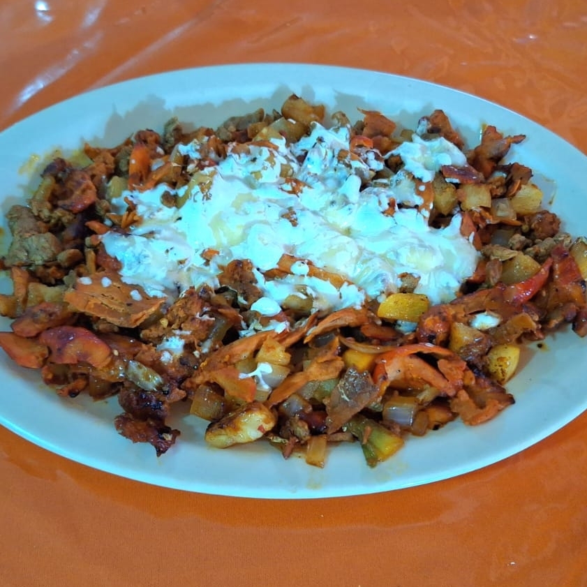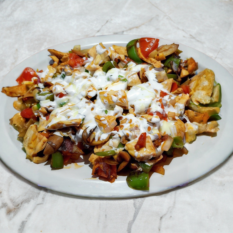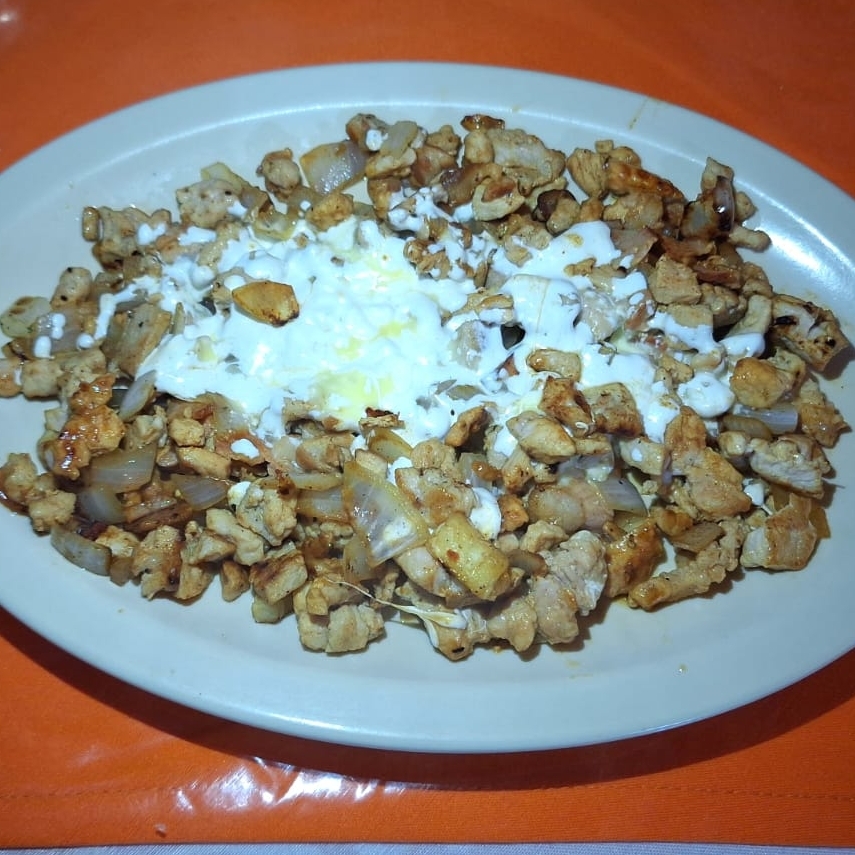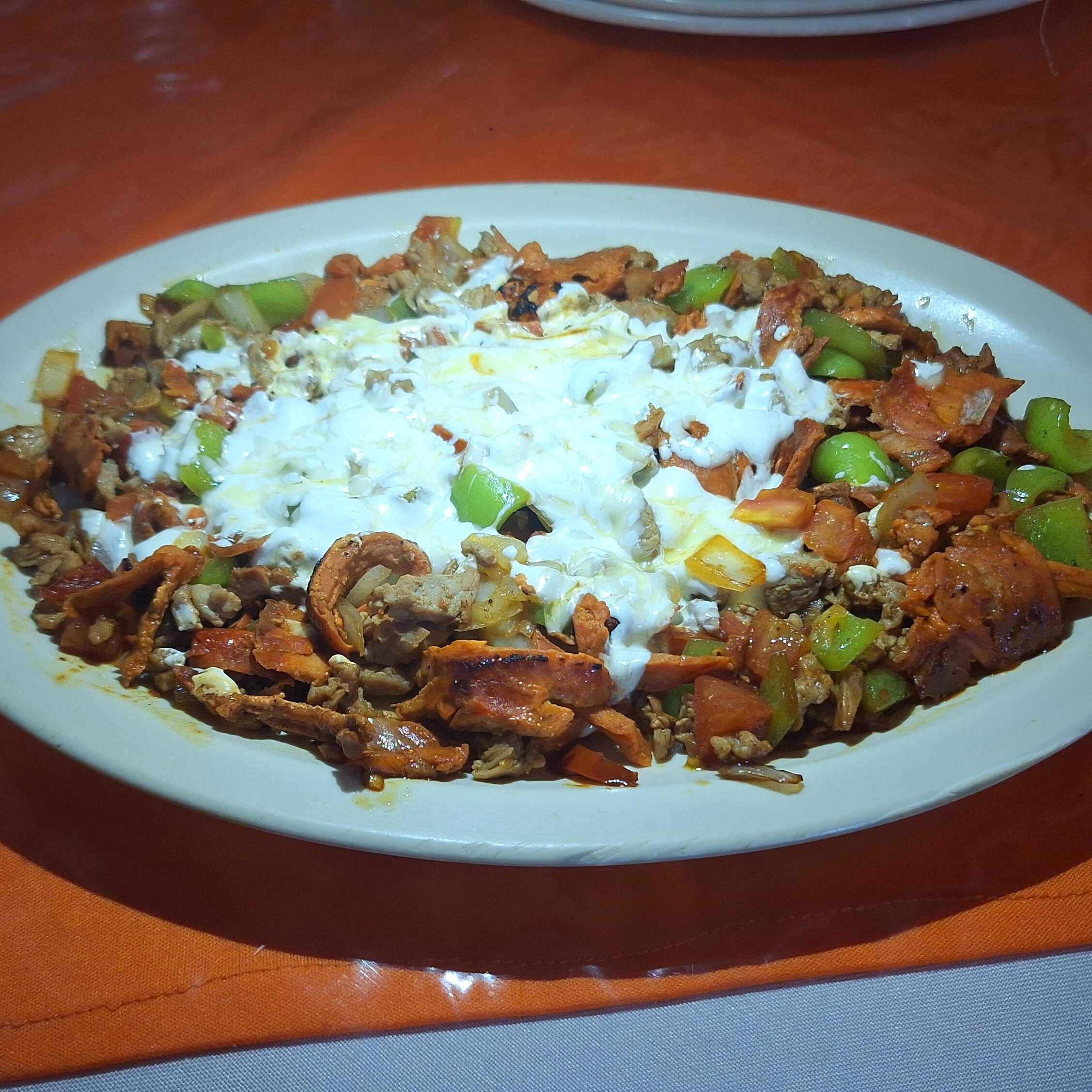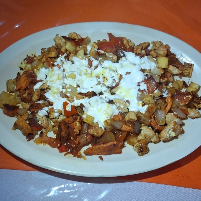 Mezcla de pollo, cebolla, morrón, jitomate, champiñones y queso fundido.