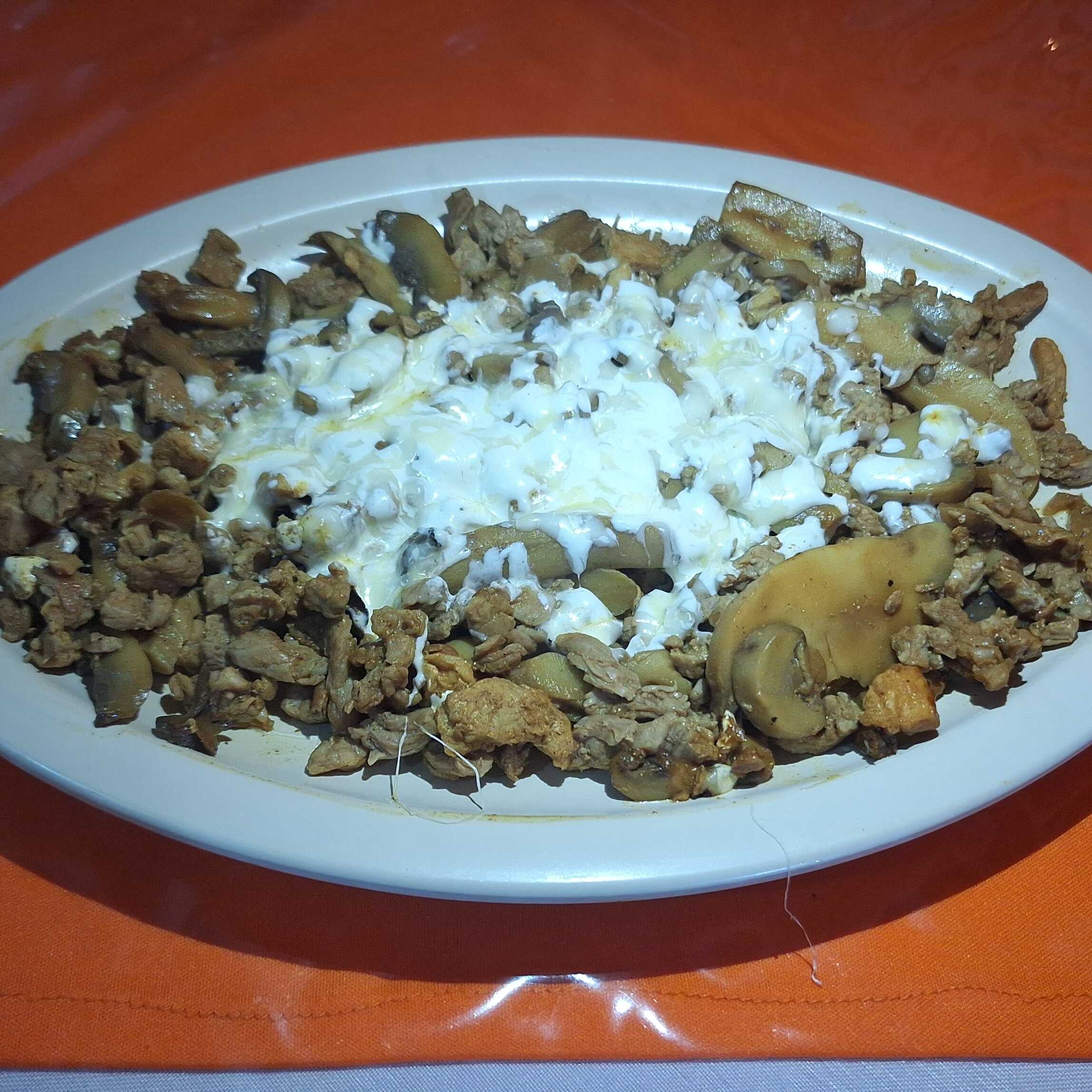 Alambre de bistec con champiñones y queso, ideal para paladares ligeros.