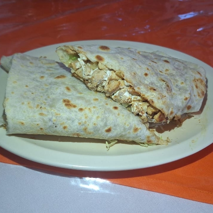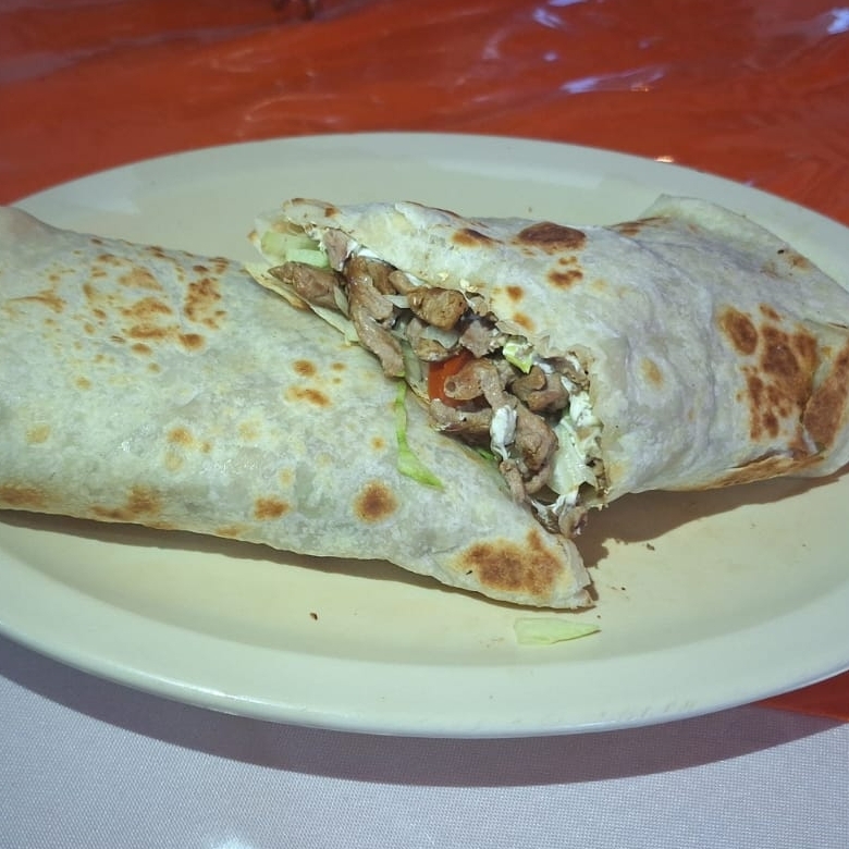 Combinación de bistec, jamón y queso en tortilla de harina.