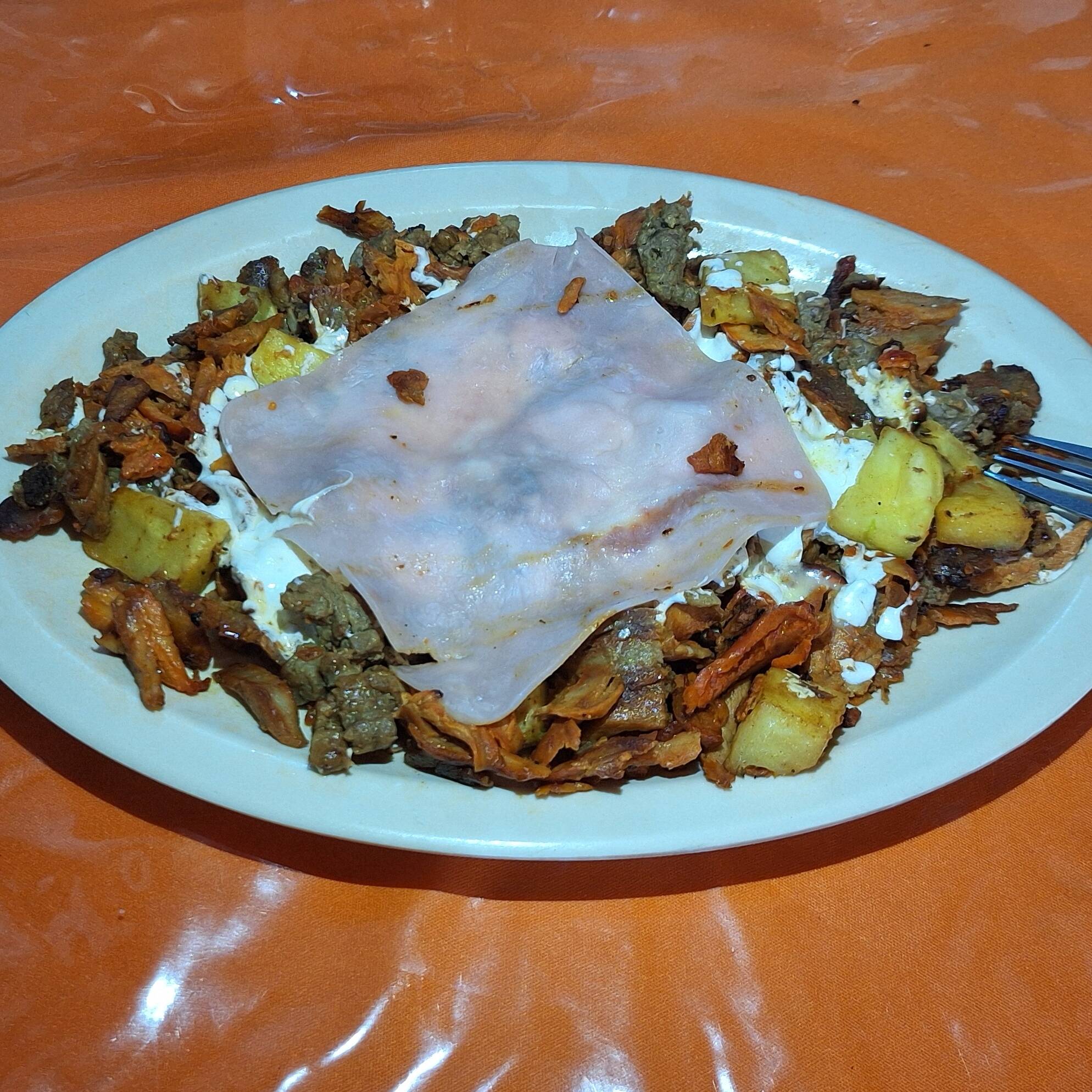 Mezcla deliciosa de bistec, jamón, pastor, piña y queso derretido.