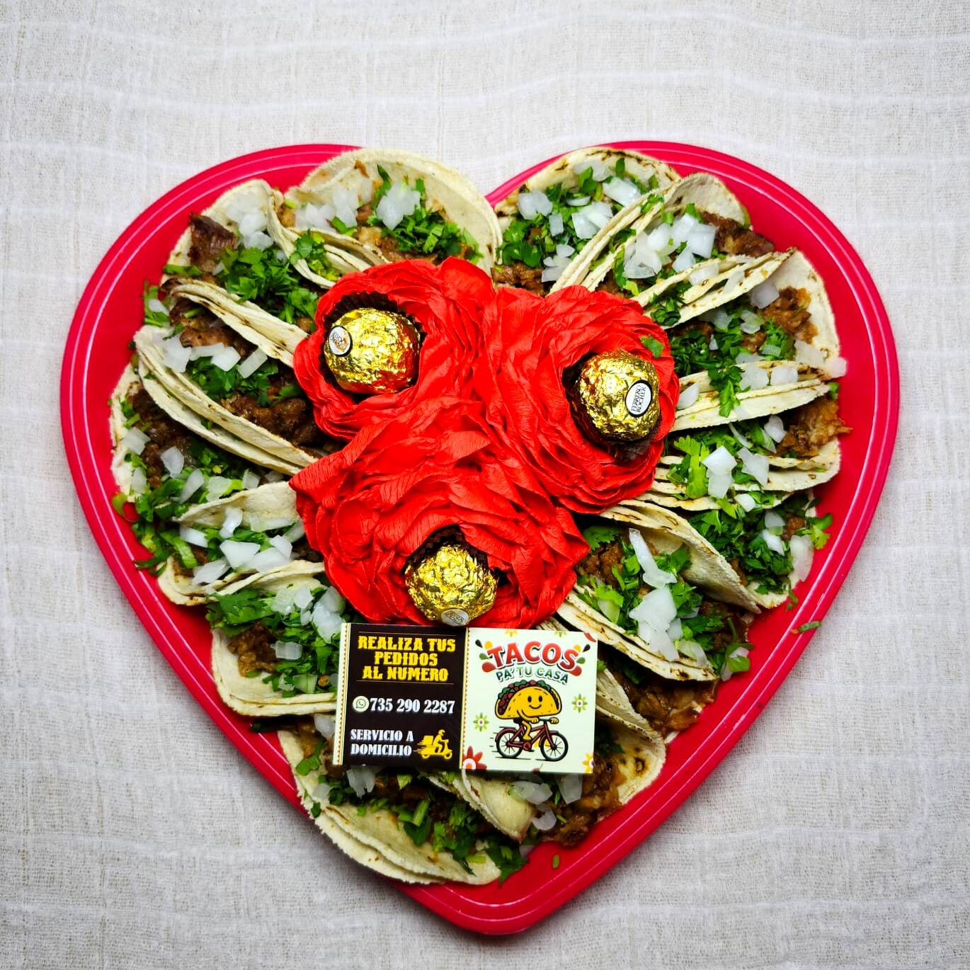 Incluye charola de corazón tal como se ve en la foto. Tres rosas y tres chocolates Ferrero Rocher,15 tacos surtidos, complementos (salsas, cacahuates, limones,rábanos,pepinos, cebollitas y nopales)