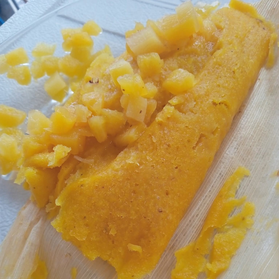 Tamal sabor a piña con mermelada de piña envuelto en hoja de maíz con aluminio