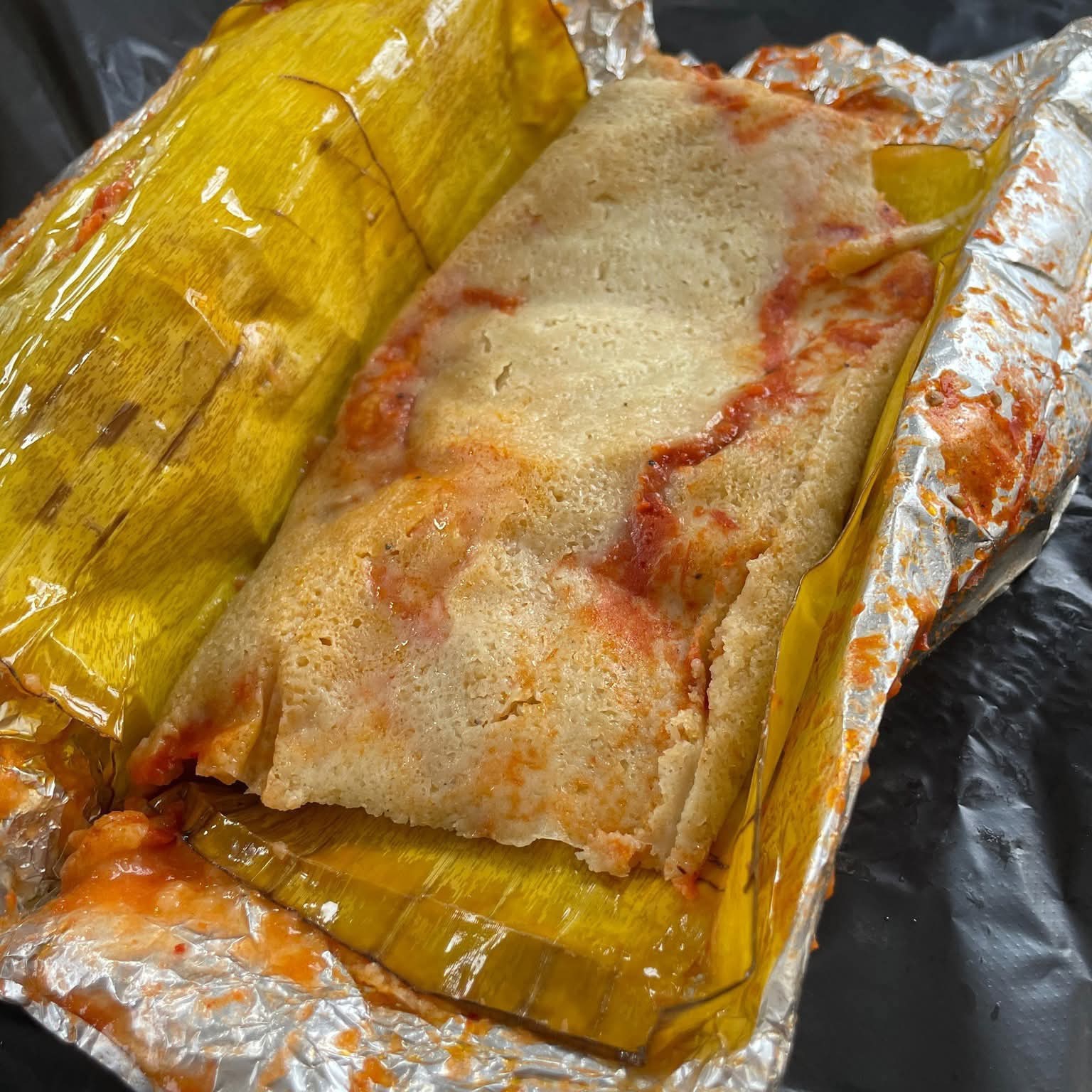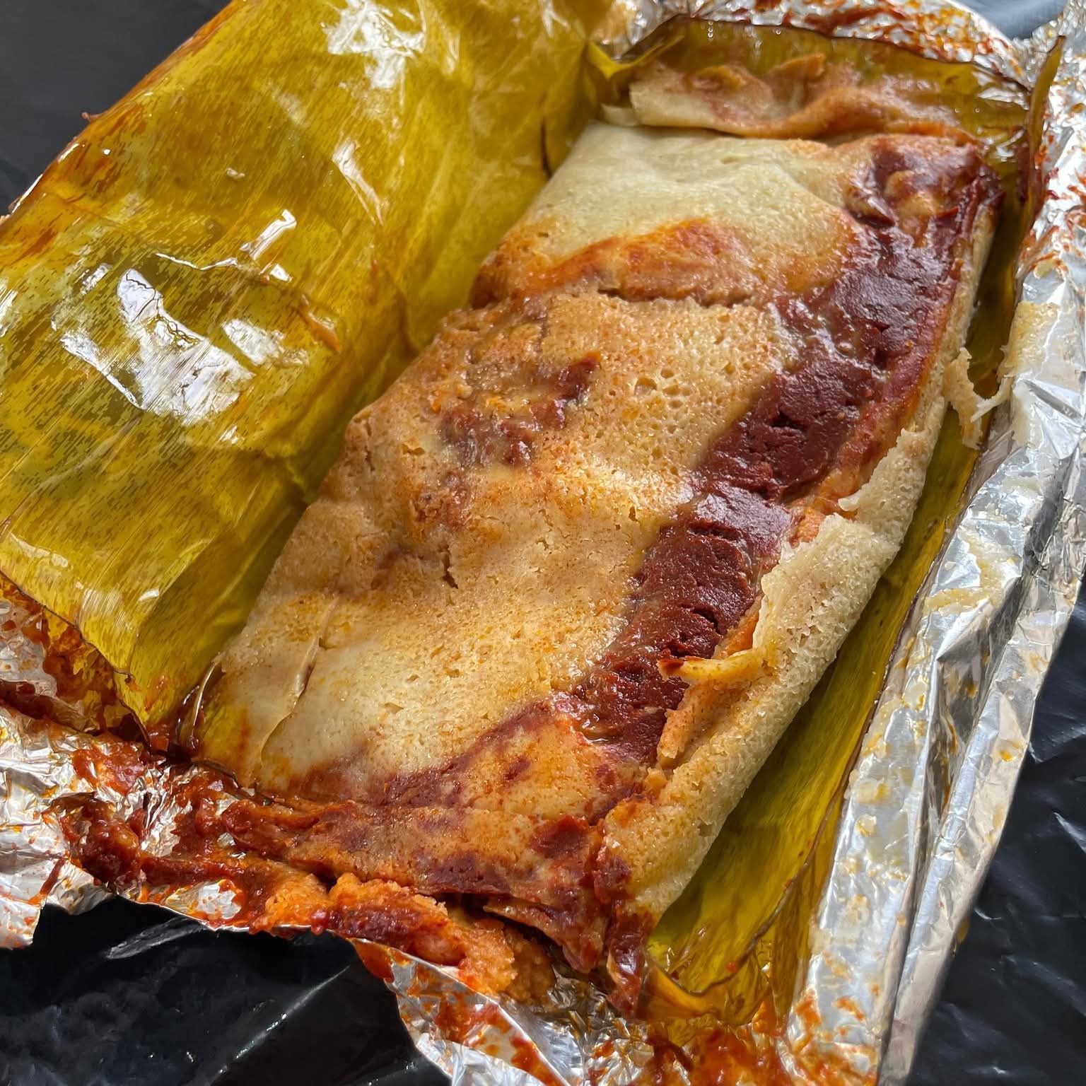 Tamal Oaxaqueño envuelto en hoja de plátano con carne de puerco deshebrada en adobo de guajillo.