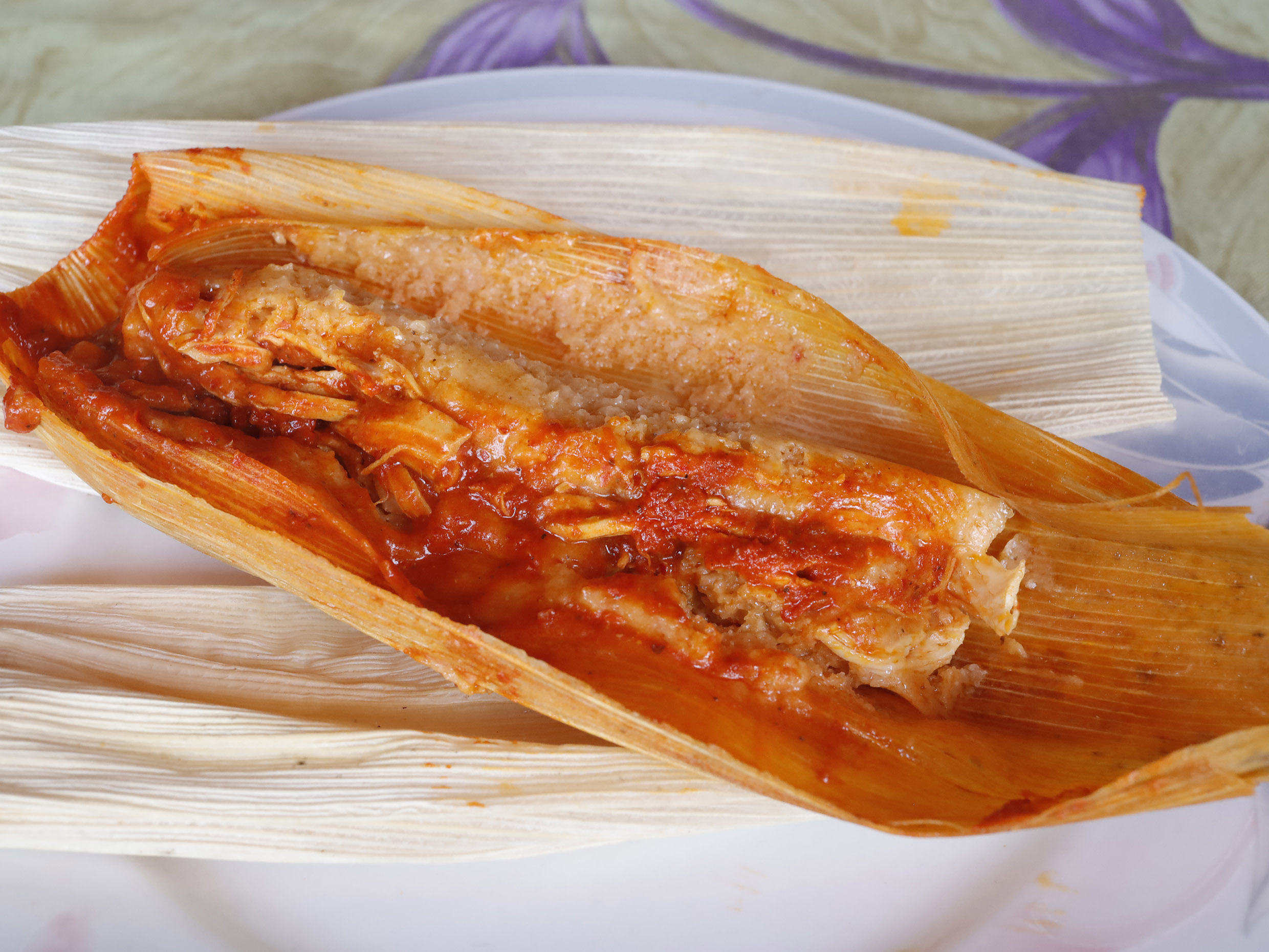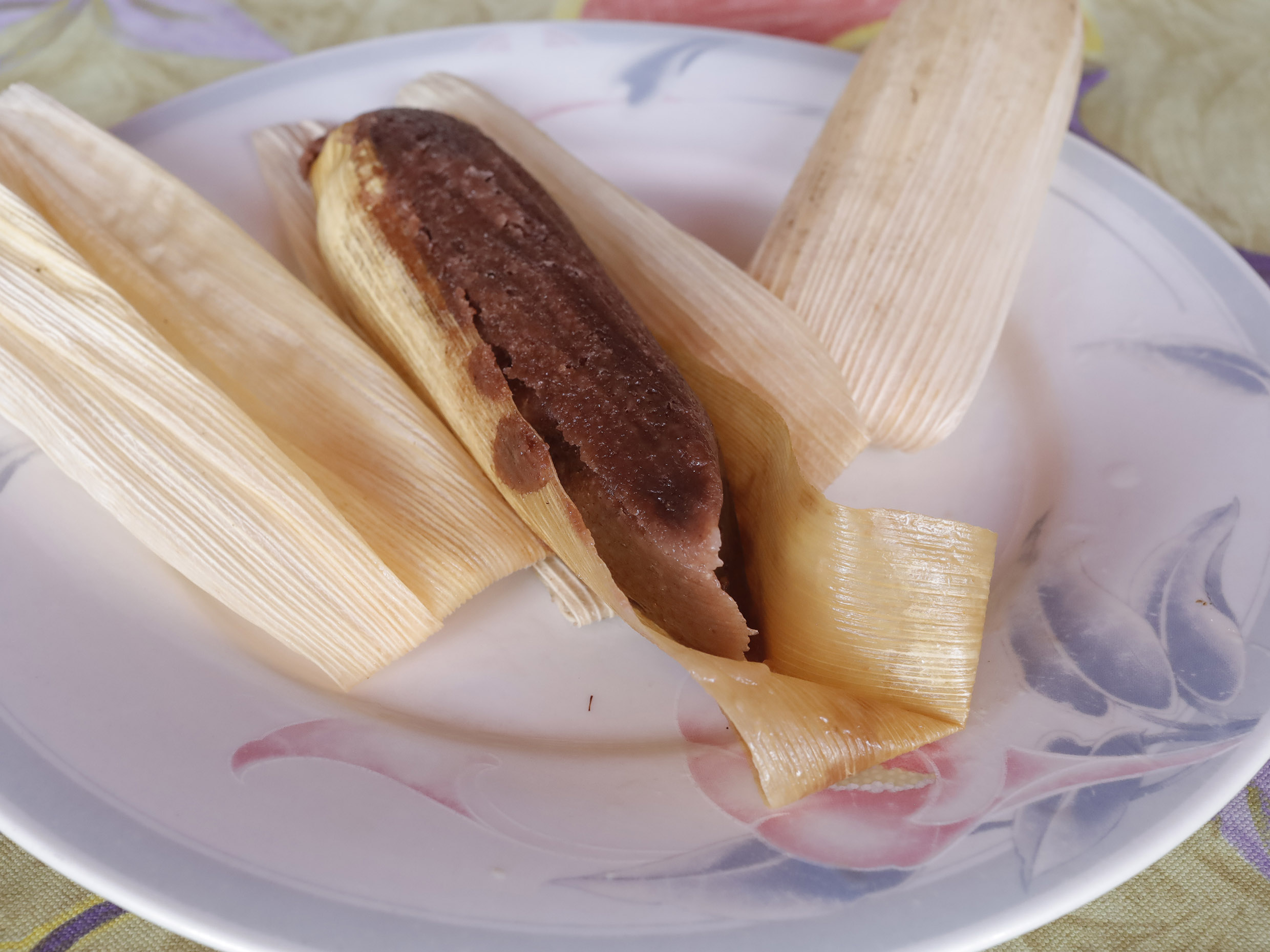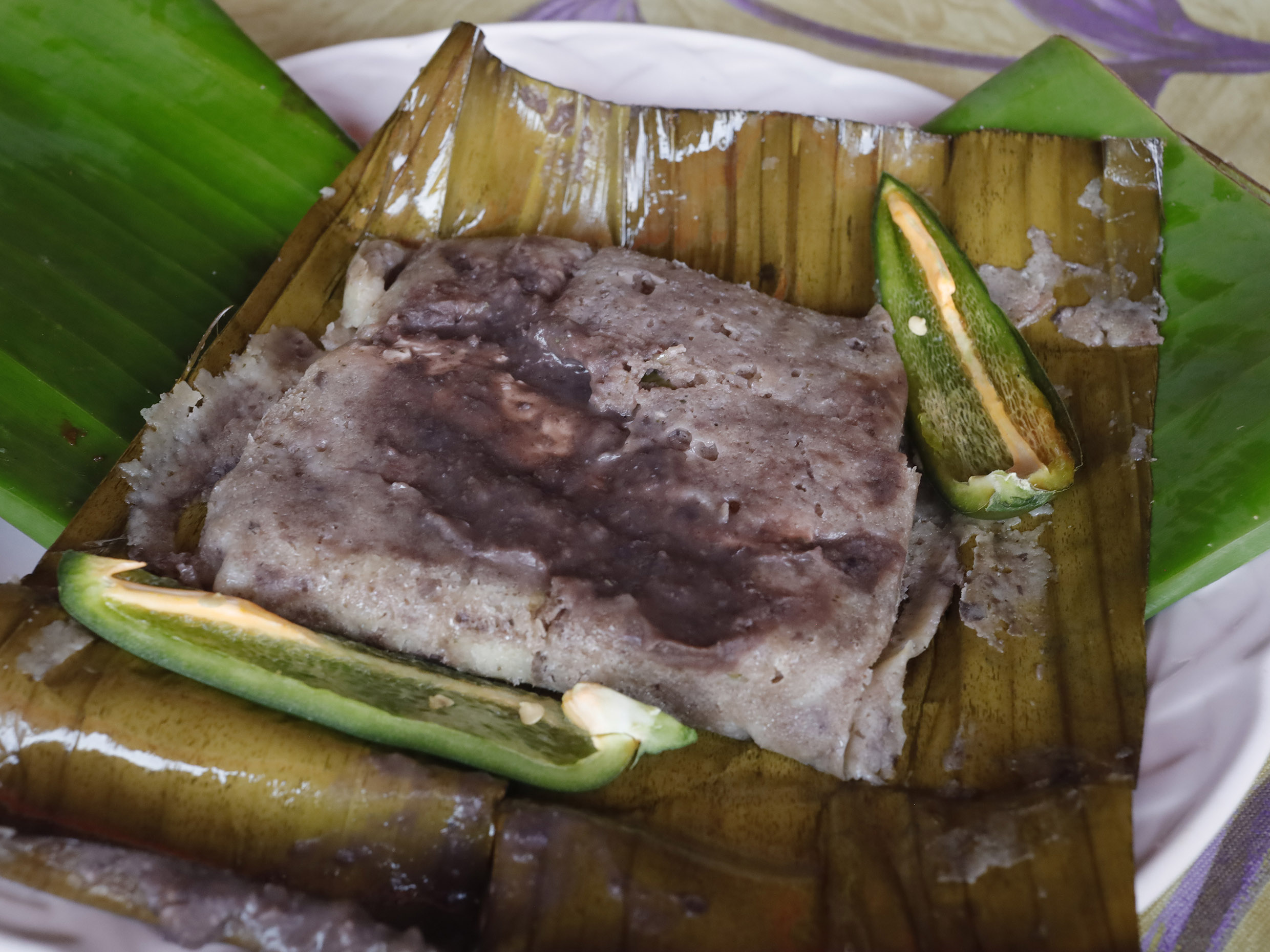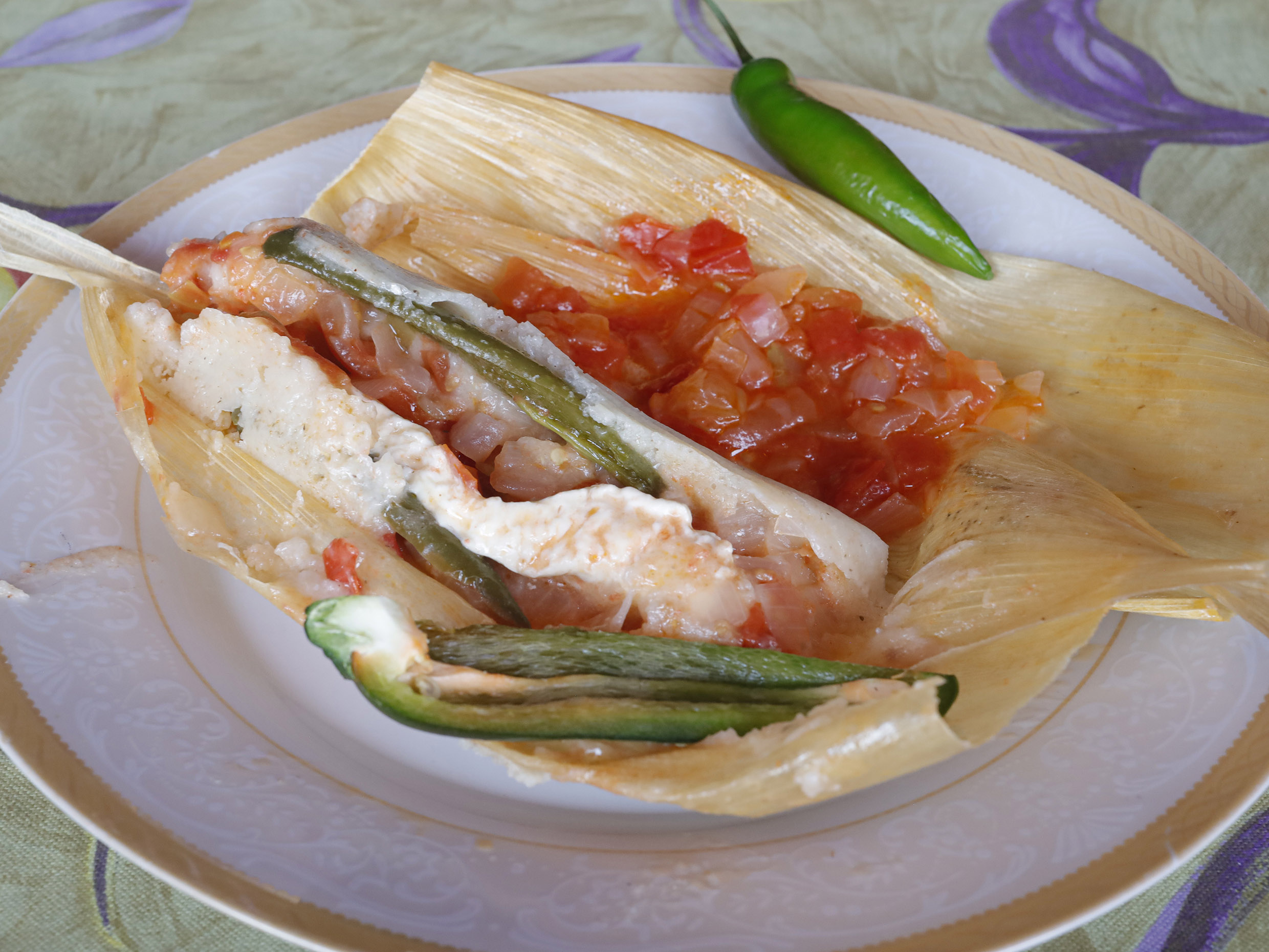 Tamal de frijol, queso panela y rajas de chile jalapeño.