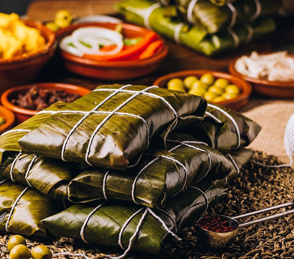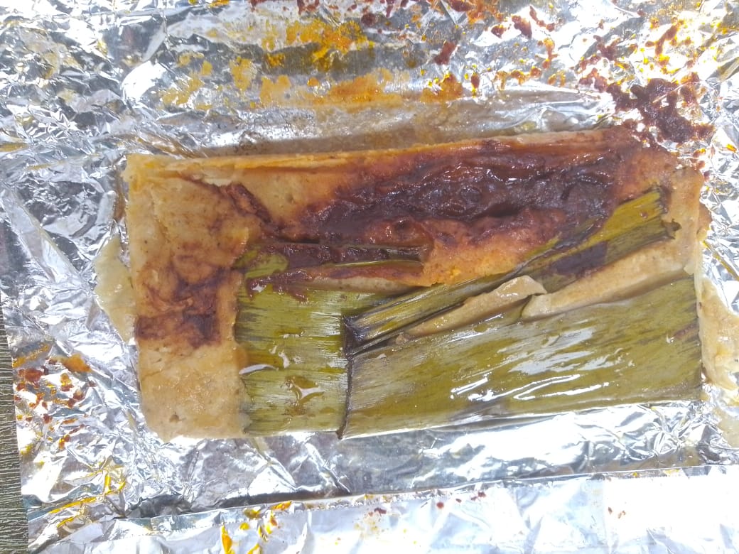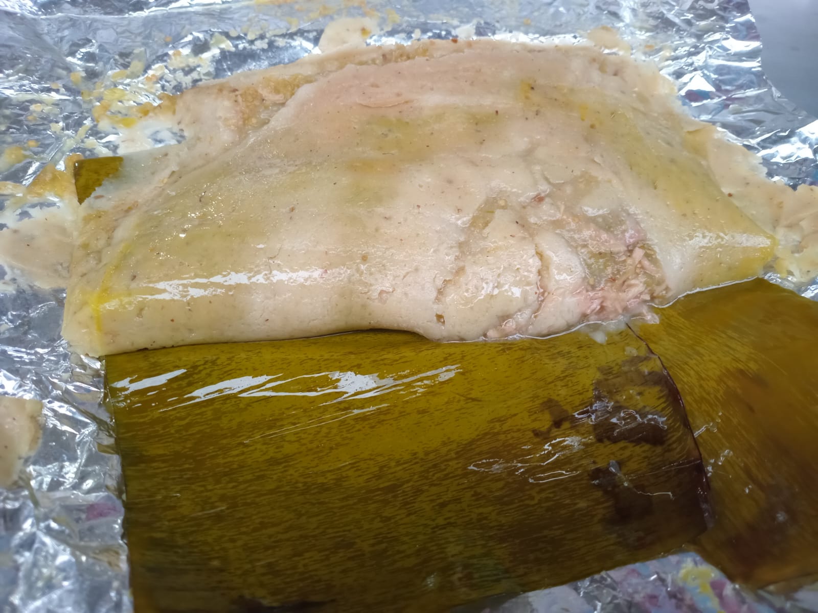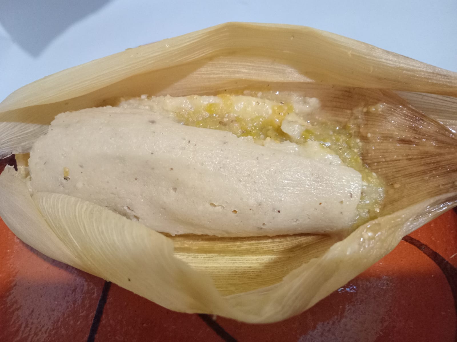 Tamal oaxaqueño con alita de pollo, cilantro, serrano y salsa verde