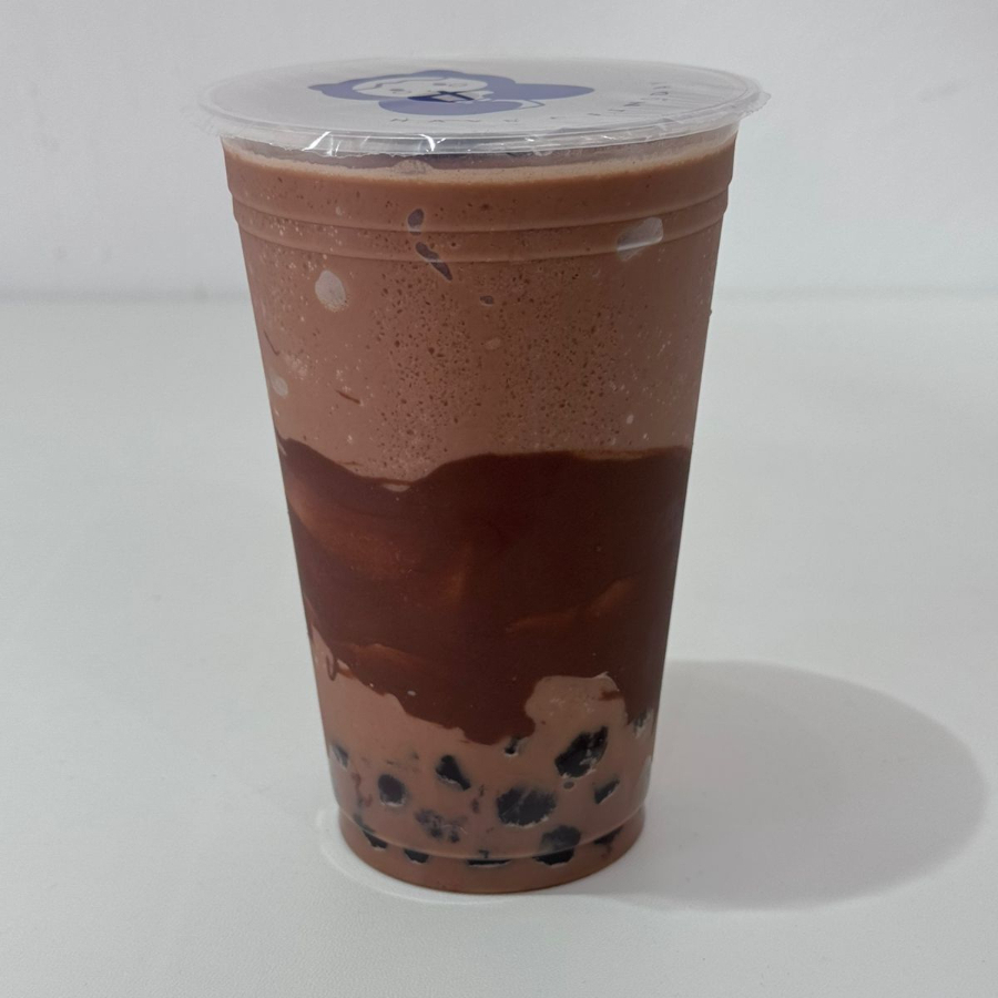Frappe de pastelito choco roles con leche evaporada y perlas de tapioca negra.