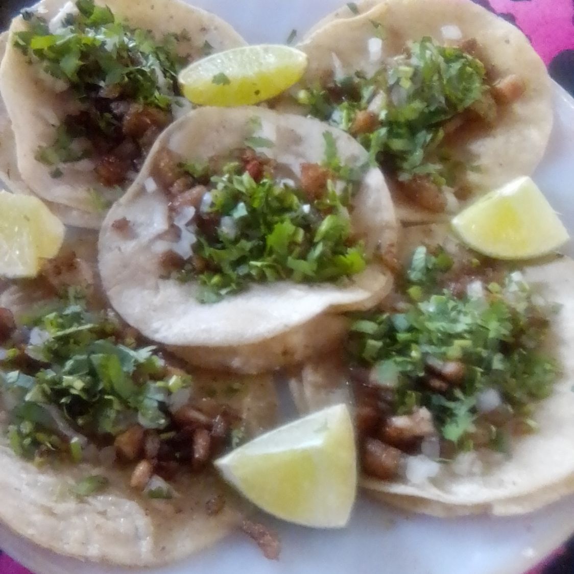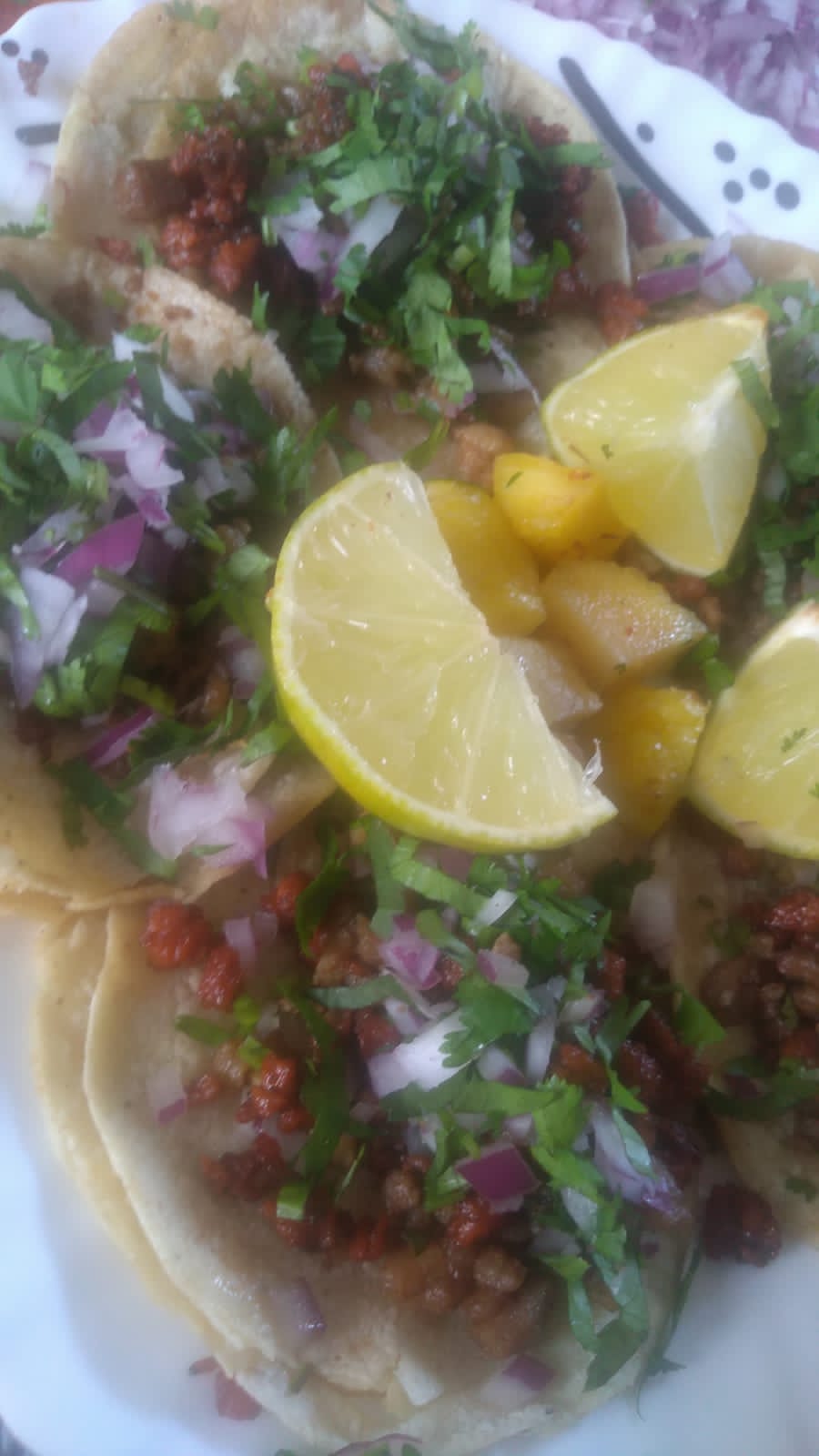 Un kilo d carne d pastor con medio kilo de tortillas, piña cilantro y cebolla,limones y salsa