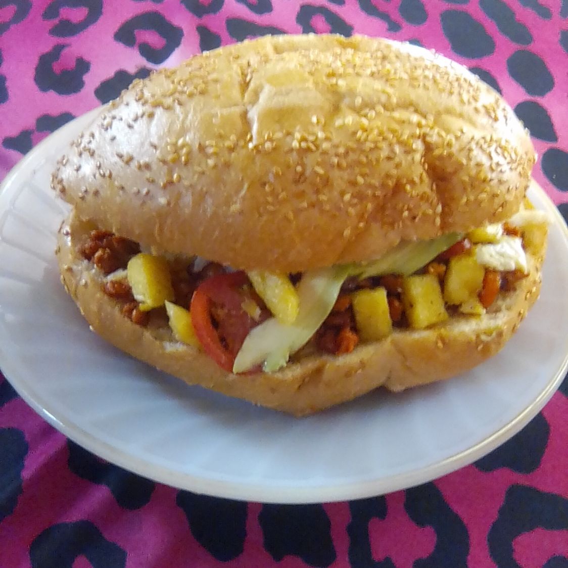 Bollo con ajonjolí con carne de res jamón manchego piña lechuga jitomate y
