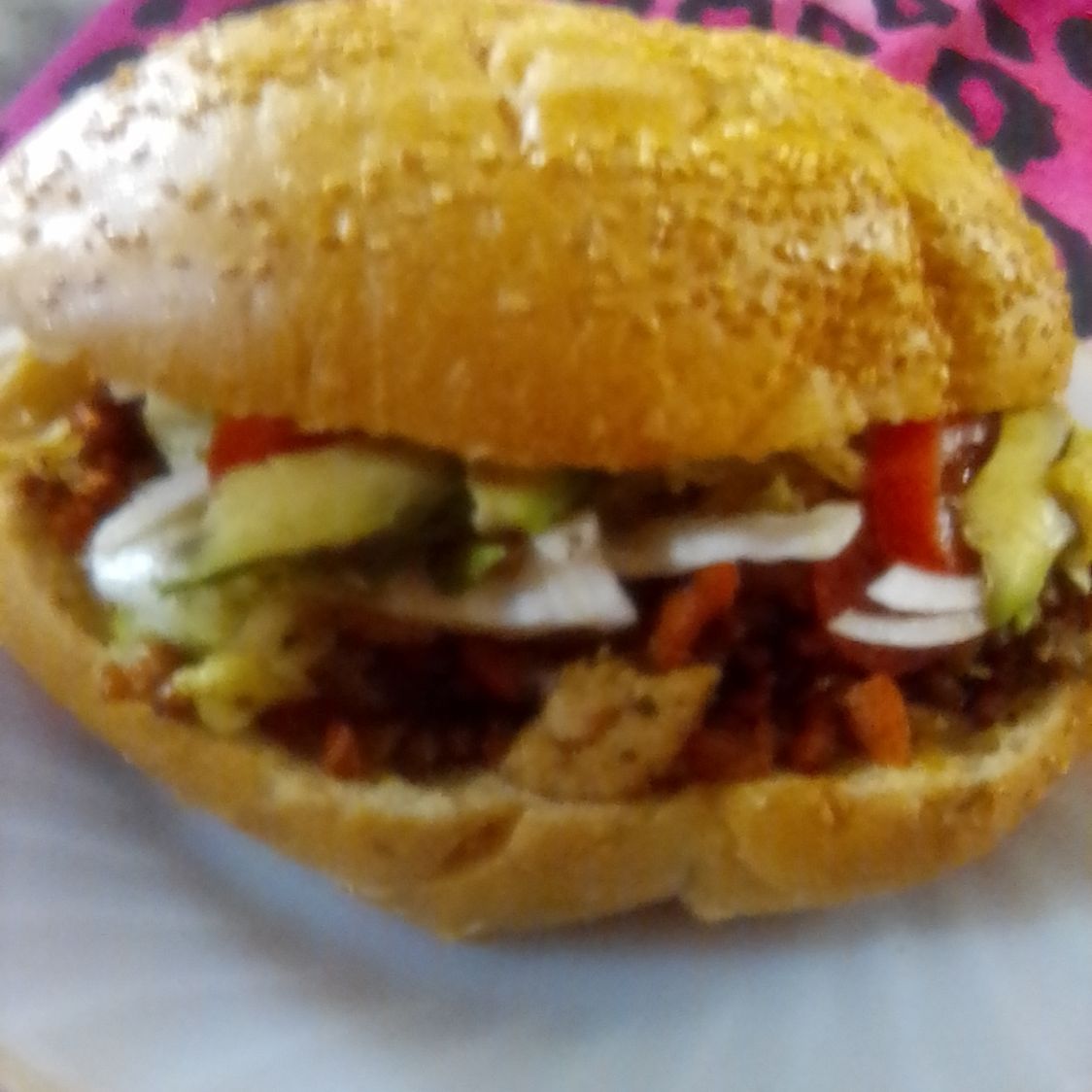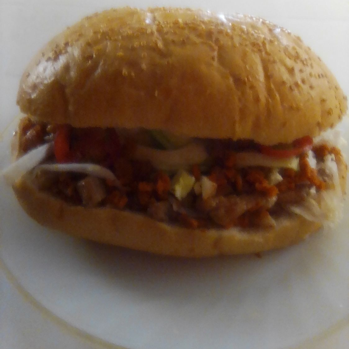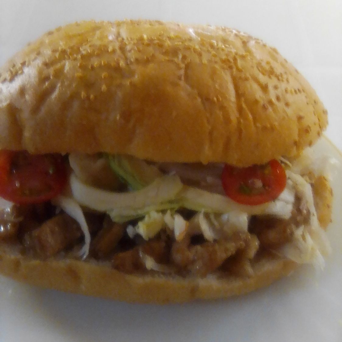 Bollo con ajonjolí carne res jamón pierna salchichas bistec con queso amarillo y queso manchego bañada con barbiquiur con lechuga jitomate y cebolla
