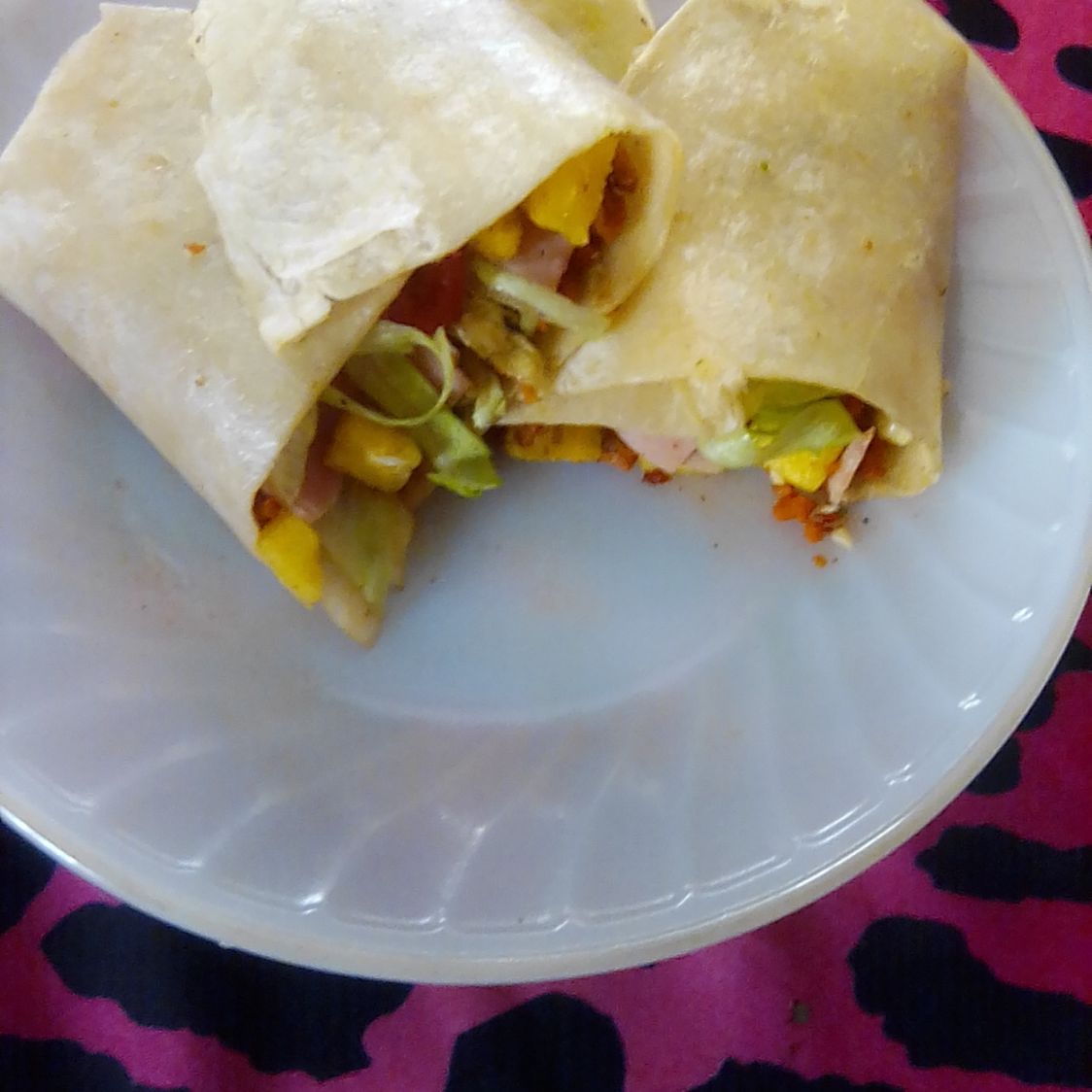 Tortilla de harina pastor piña con queso lechuga jitomate y cebolla