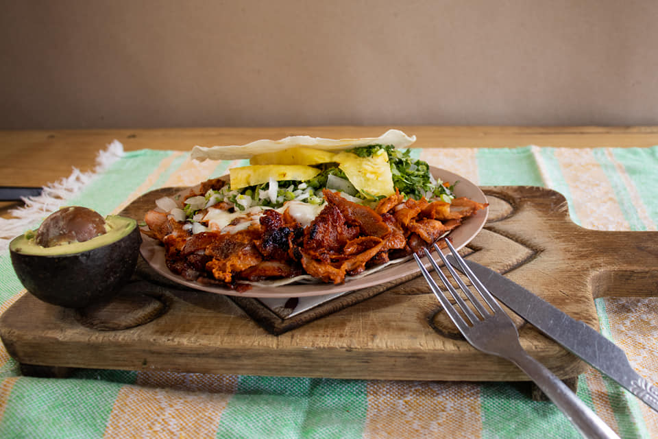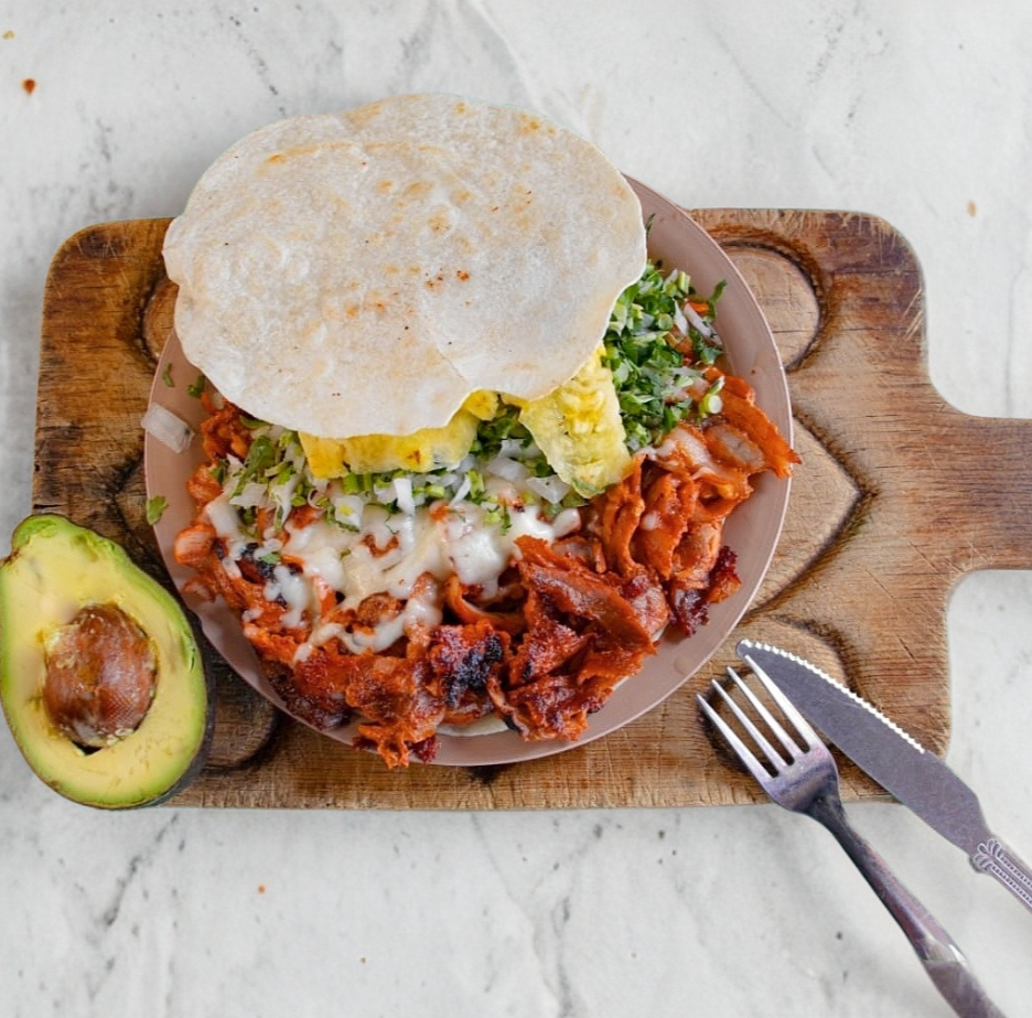Pastor, Frijoles, ( cebolla y jitomate sazonado ), aguacate y queso.