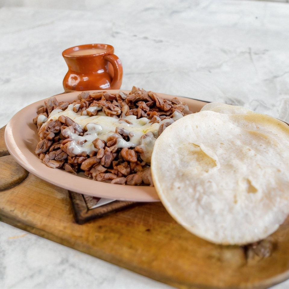Costilla, frijoles, (cebolla y jitomate sazonado), aguacate y queso.