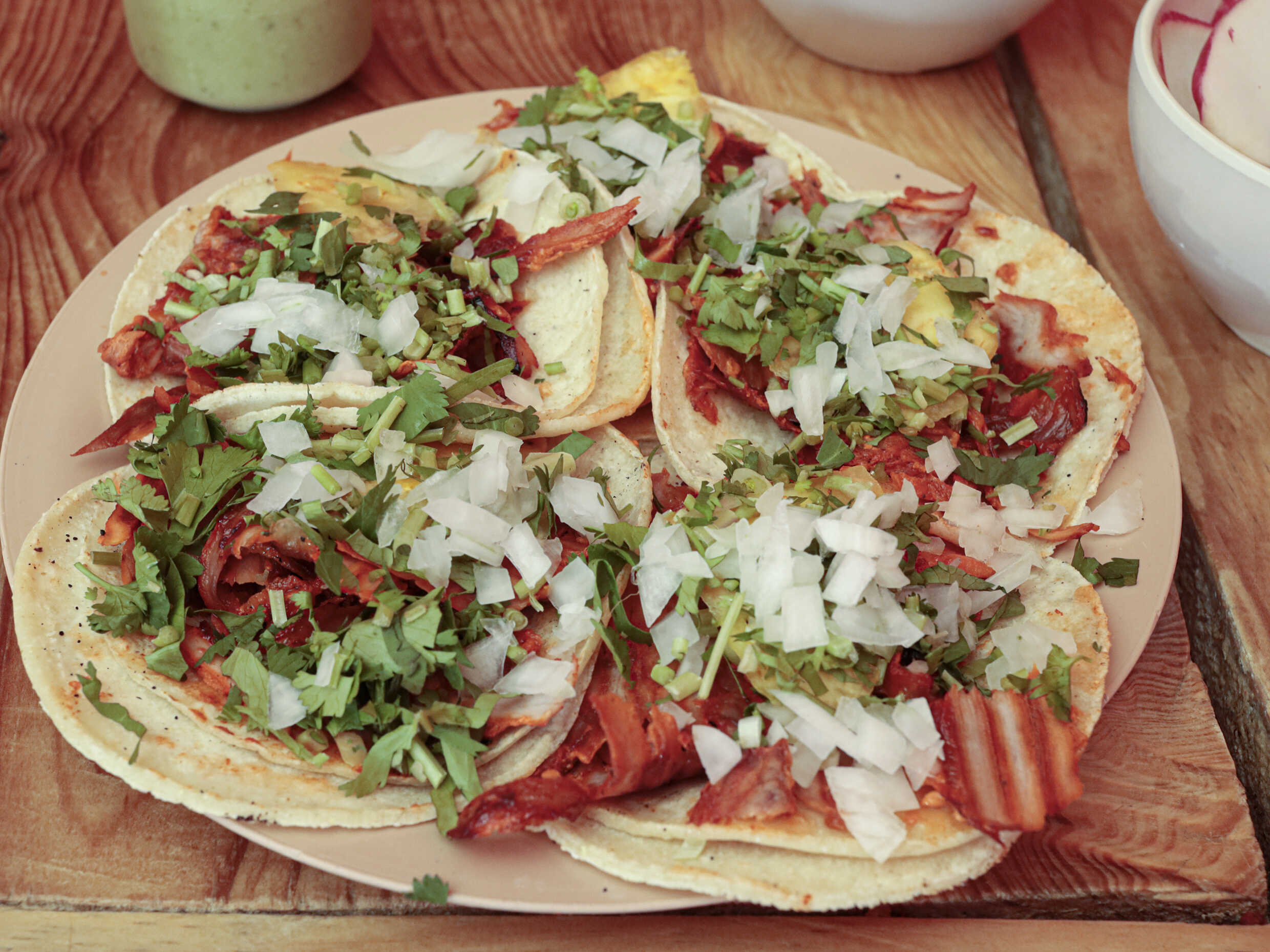 Cebolla, cilantro, piña, limones, rábanos, salsa y tortillas de maíz