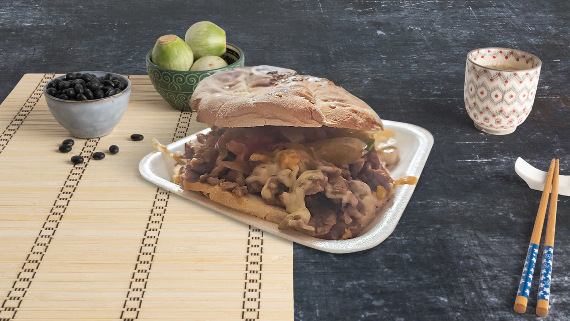 Bistec, tocino, morrón, cebolla y queso.