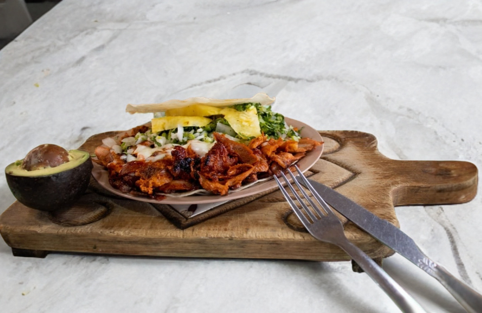 Pastor, tortilla de harina, queso, cebolla, cilantro y piña.