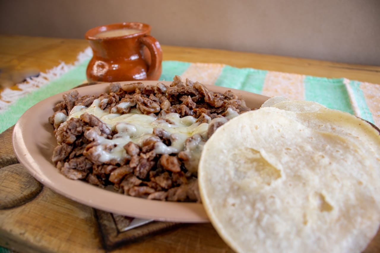 Bistec, queso y 9 tortillas de maíz.
