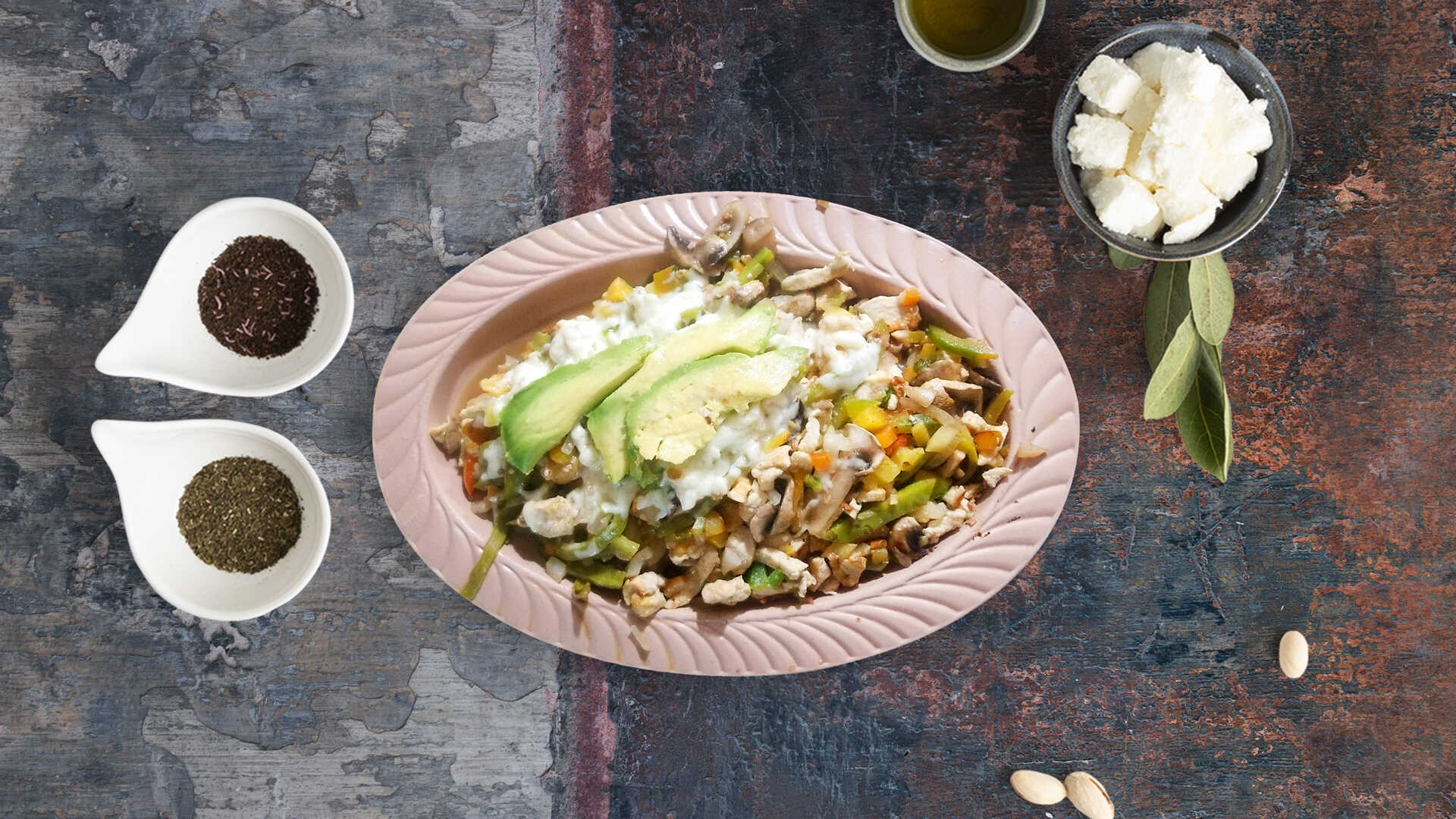 Morrón, cebolla, champiñón, nopales, piña, aguacate y queso.