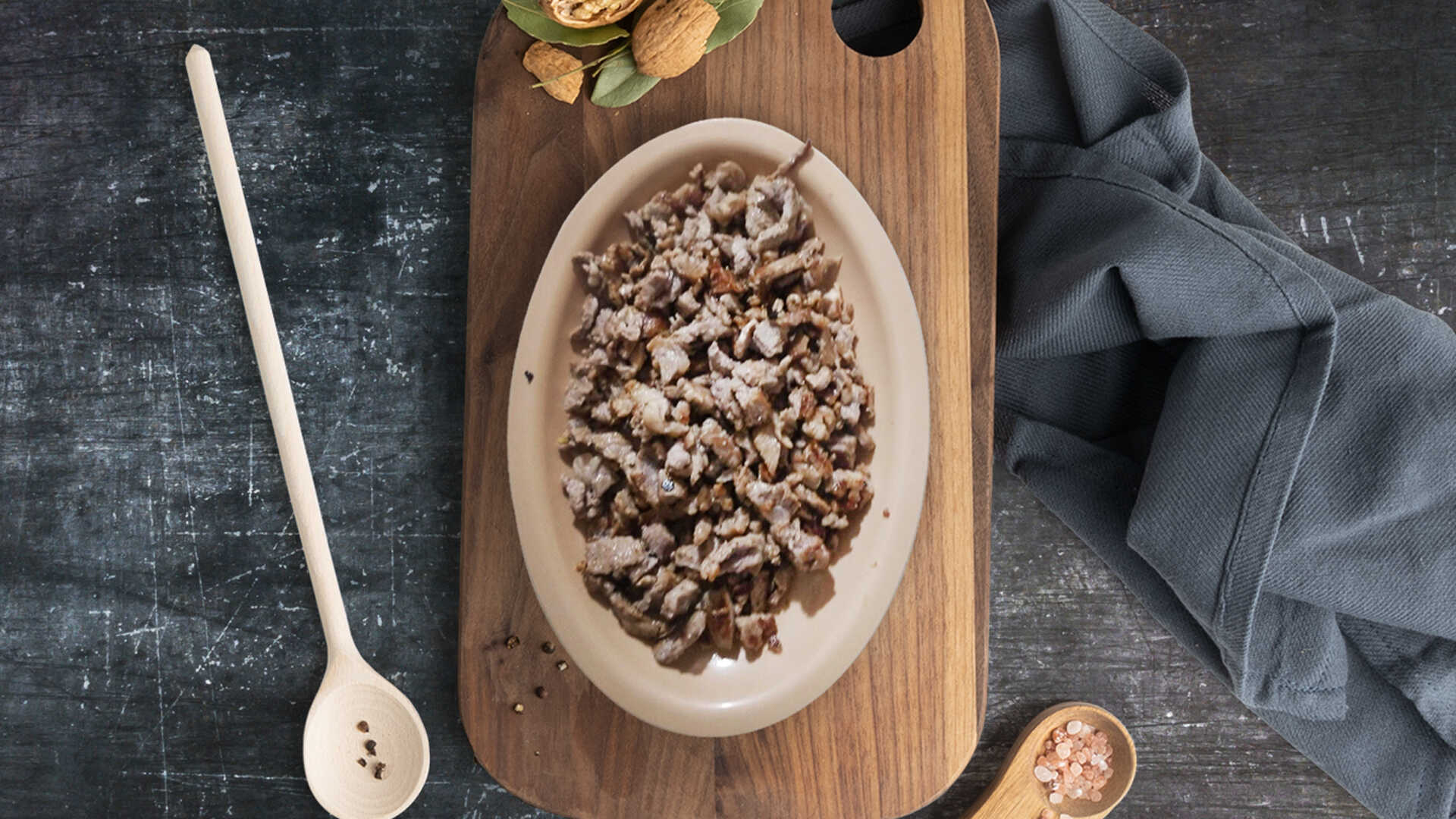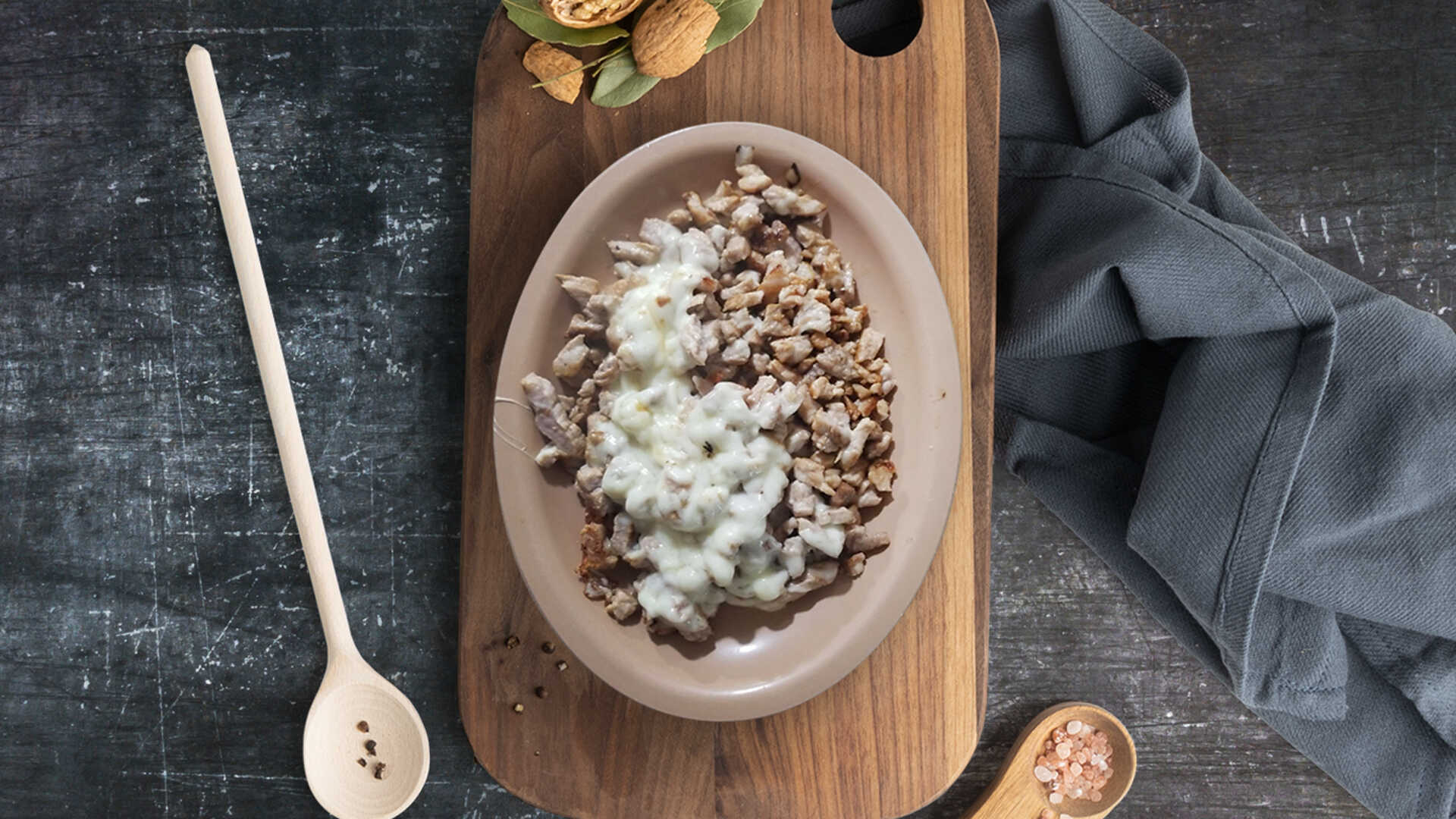 Sal, mantequilla, chuleta, tocino, con morrón, cebolla, queso y crema.
