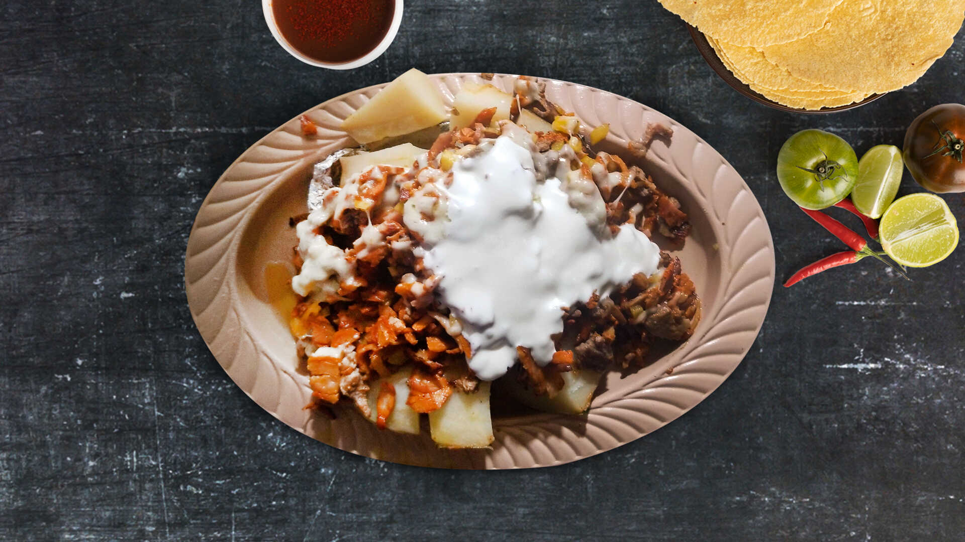 Costilla, tortilla de harina, queso, cebolla y cilantro.