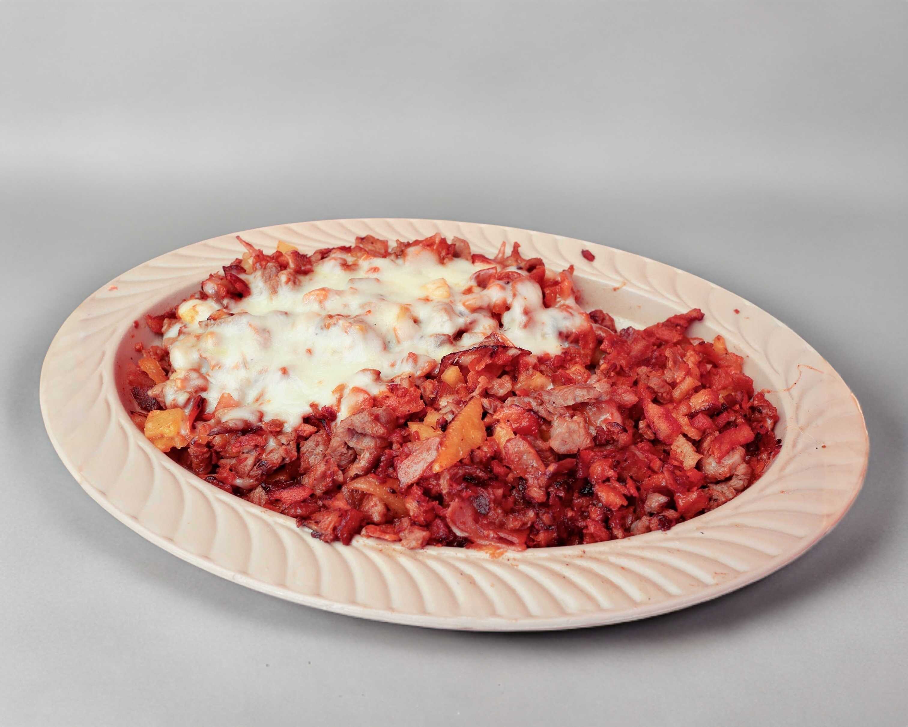 Pastor, tocino, morrón, cebolla y queso.