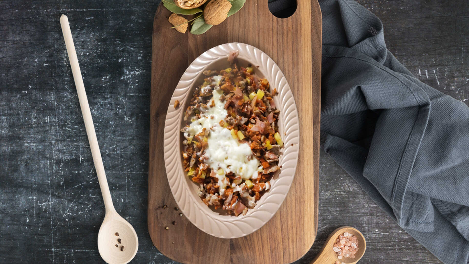 Sal, mantequilla, costilla, tocino, morrón, cebolla, queso y crema.