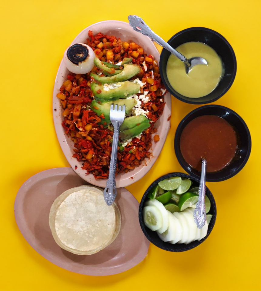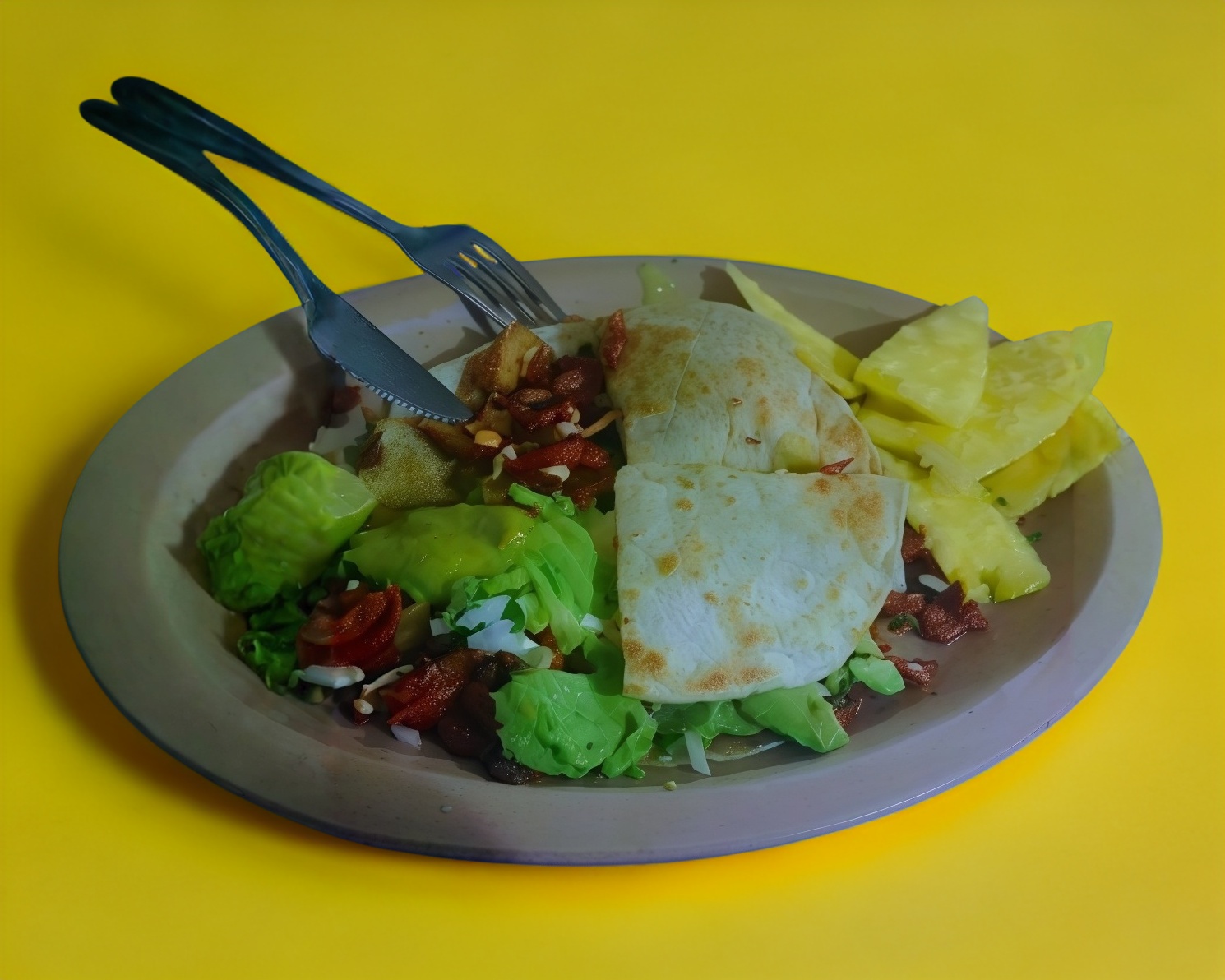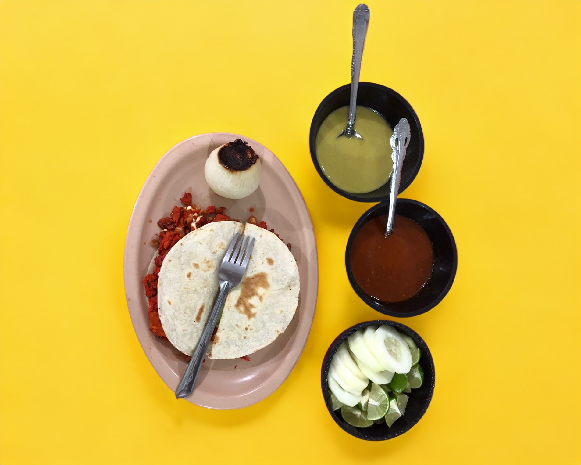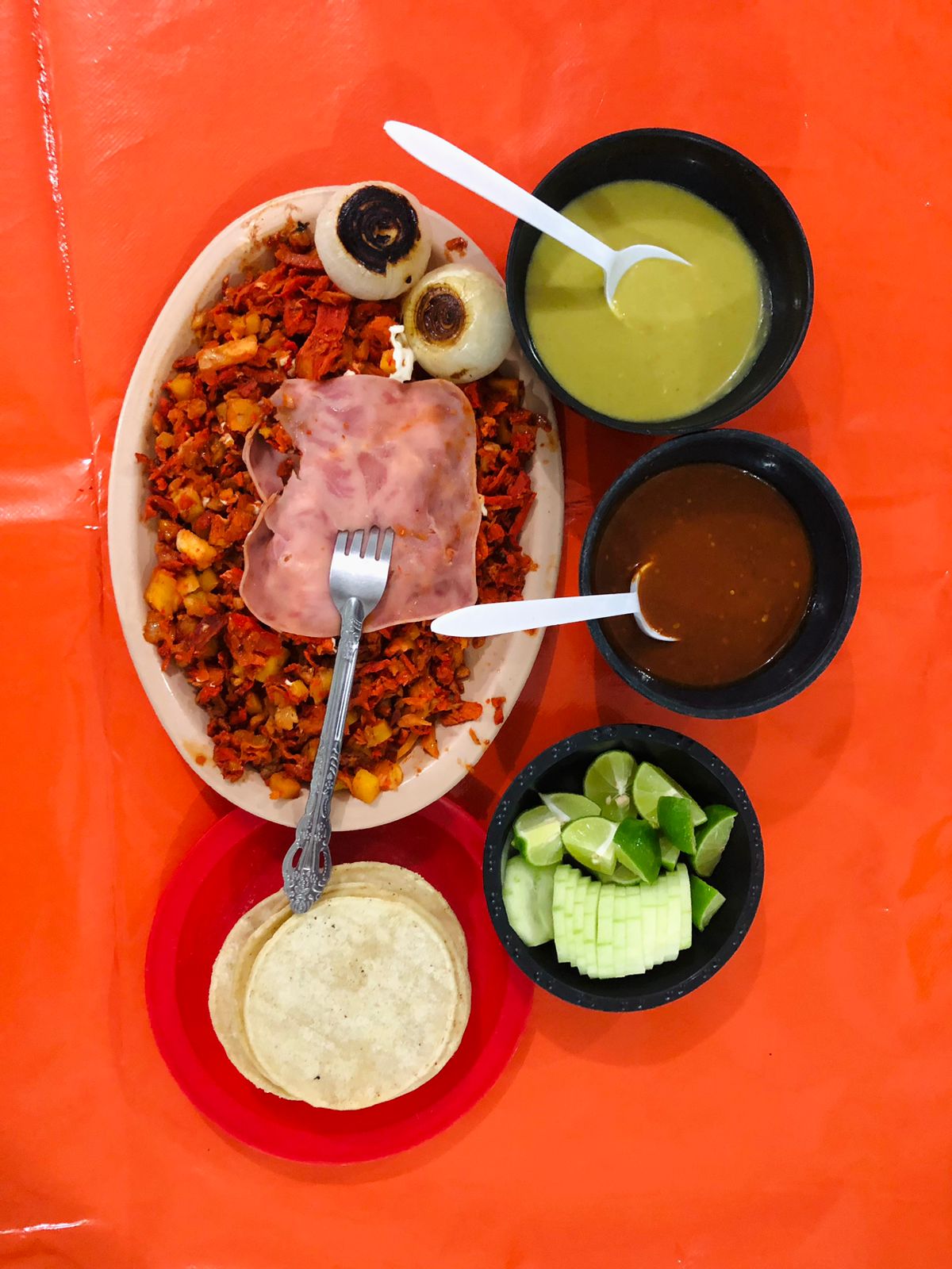 Verdura (cilantro y cebolla), pepinos, piña y tortillas de maíz.