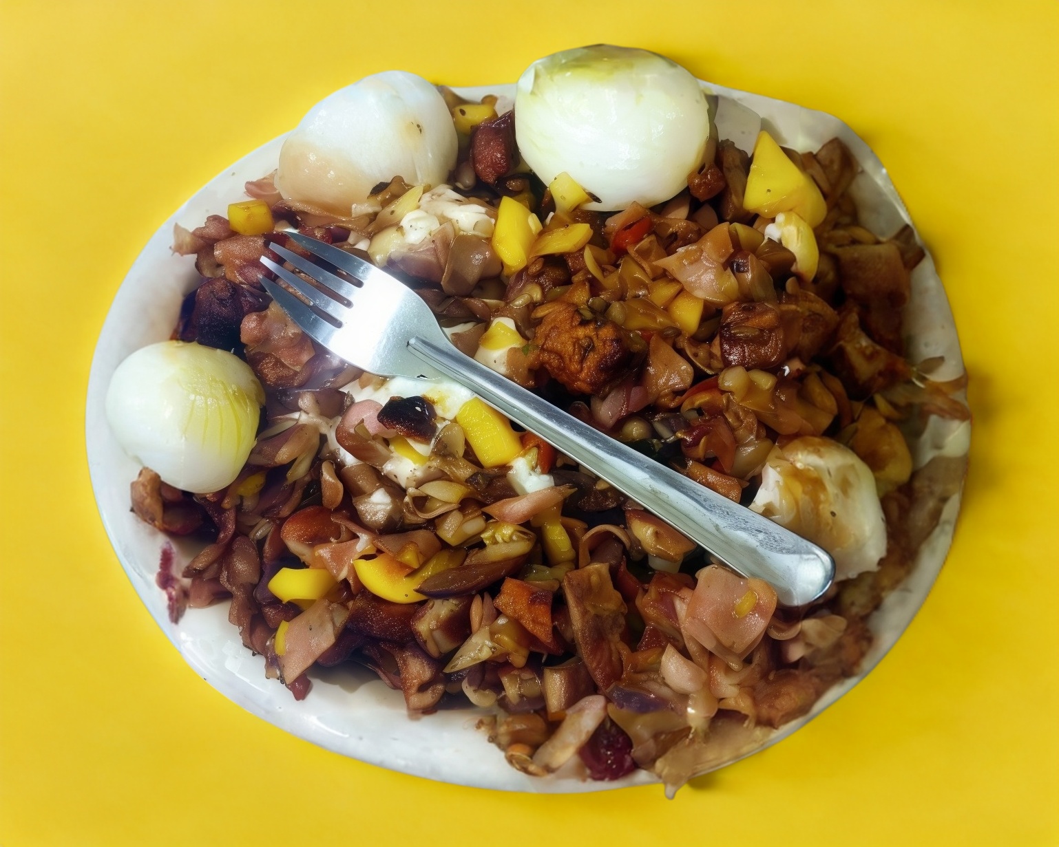 Bistec, morrón, cebolla, piña, jamón y queso.