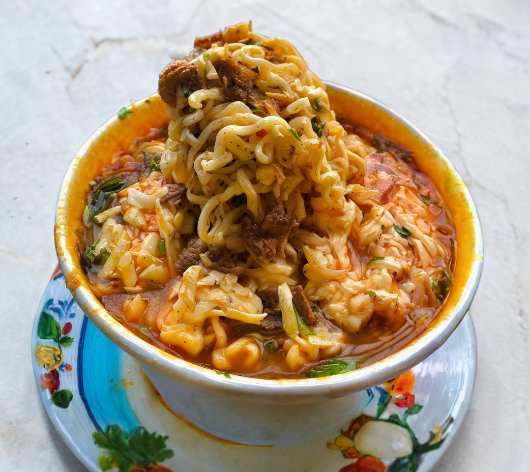 Sopa Maruchan cocida con nuestro único y delicioso jugo de carne acompañada con 2 tipos de carne a tu elección.