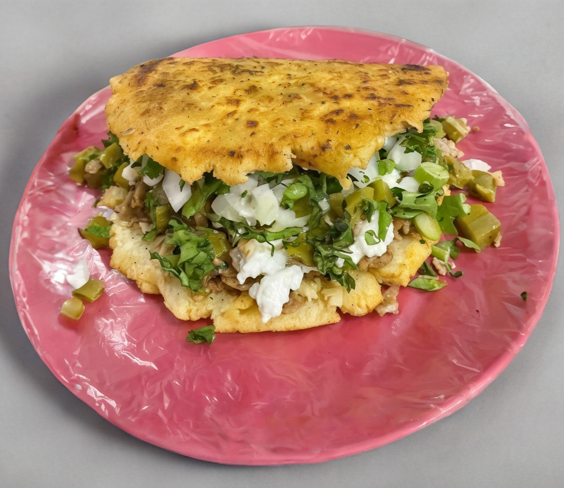 Gordita de maíz frita con combinación de 2 carnes a tu gusto.