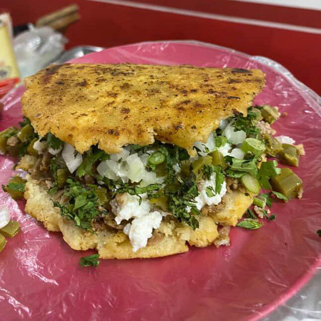 Gordita de maíz frita rellena de bistec tierno y sabroso.