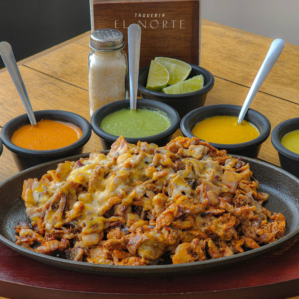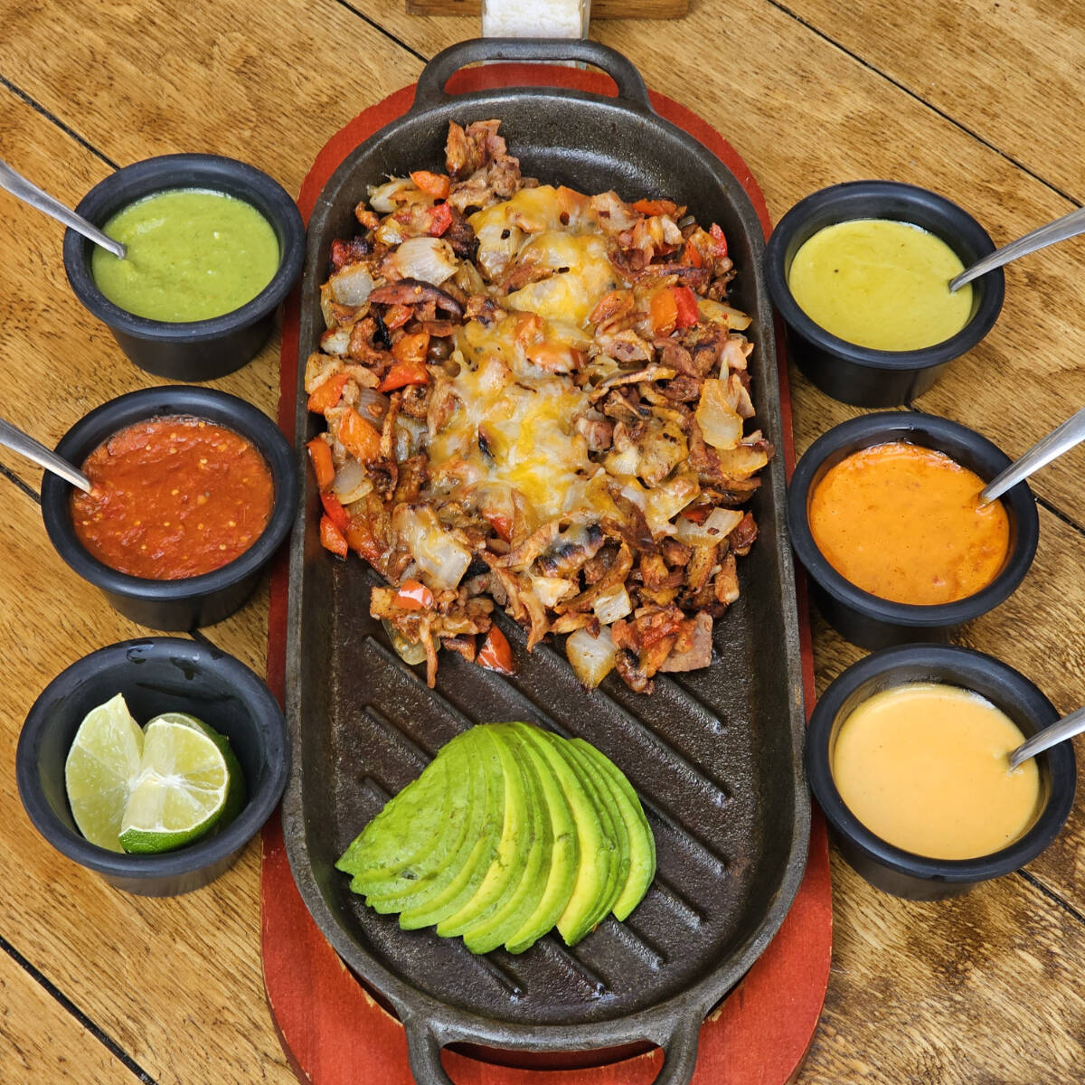 Bistec, tocino, jamón, cebolla, pimiento morrón y queso gratinado. Incluye 18 piezas de tortillas de maíz y salsas por separado.